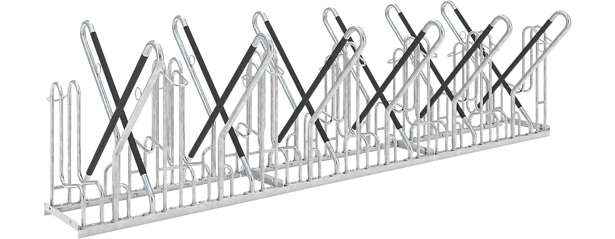 Sie bekommen den praktischen Anlehnparker mit einer unterschiedlichen Anzahl an Stellplätzen. Die Fahrradständer sind dabei für eine Reihenverbindung vorbereitet, sodass Sie beliebig viele Exemplare nebeneinander montieren können. Die Abmessungen betragen 1270 mm in der Tiefe sowie 845 mm in der Höhe, während die Breite je nach Anzahl der Stellplätze variiert.