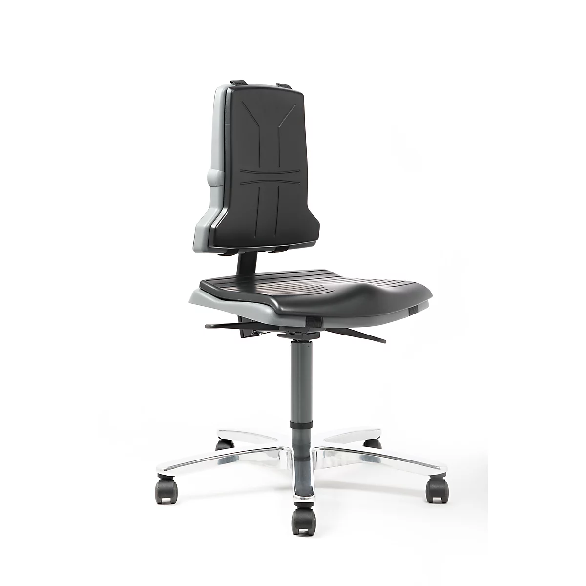 - robuste und sichere Bauweise mit Sicherheitsgasfeder, Stuhlmechanik in verstärkter Ausführung, verstärktem Fußkreuz aus Aluminium und Gasfederabdeckung aus Stahl