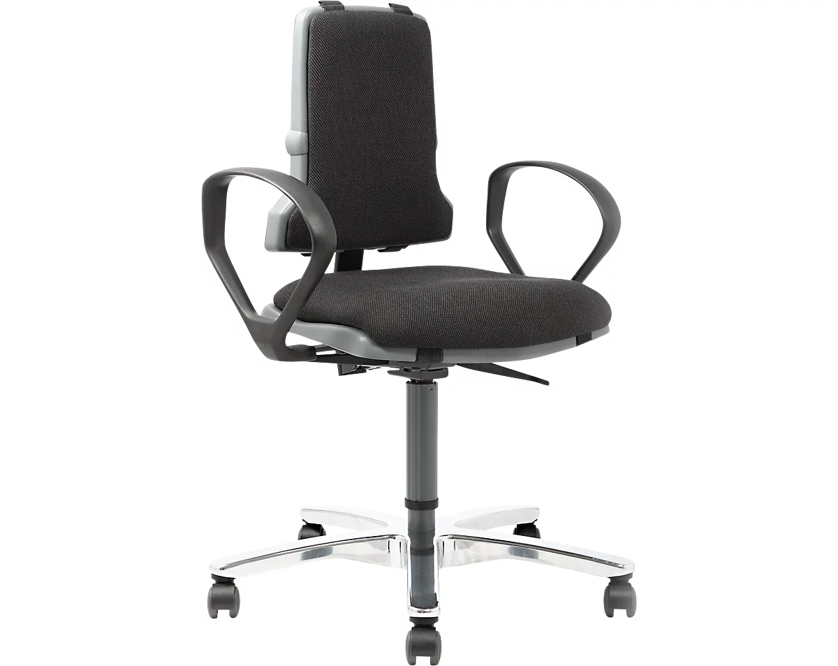 - robuste und sichere Bauweise mit Sicherheitsgasfeder, Stuhlmechanik in verstärkter Ausführung, verstärktem Fußkreuz aus Aluminium und Gasfederabdeckung aus Stahl