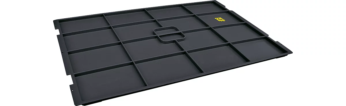 Der Auflagedeckel VDA-KLT-D 61 ESD ist geeignet für den Kleinladungsträger R-KLT ESD mit B 600 x T 400 mm. Er dient einem sicheren Verschluss, leitet Strom ab und ist hier in der Farbe Schwarz verfügbar.