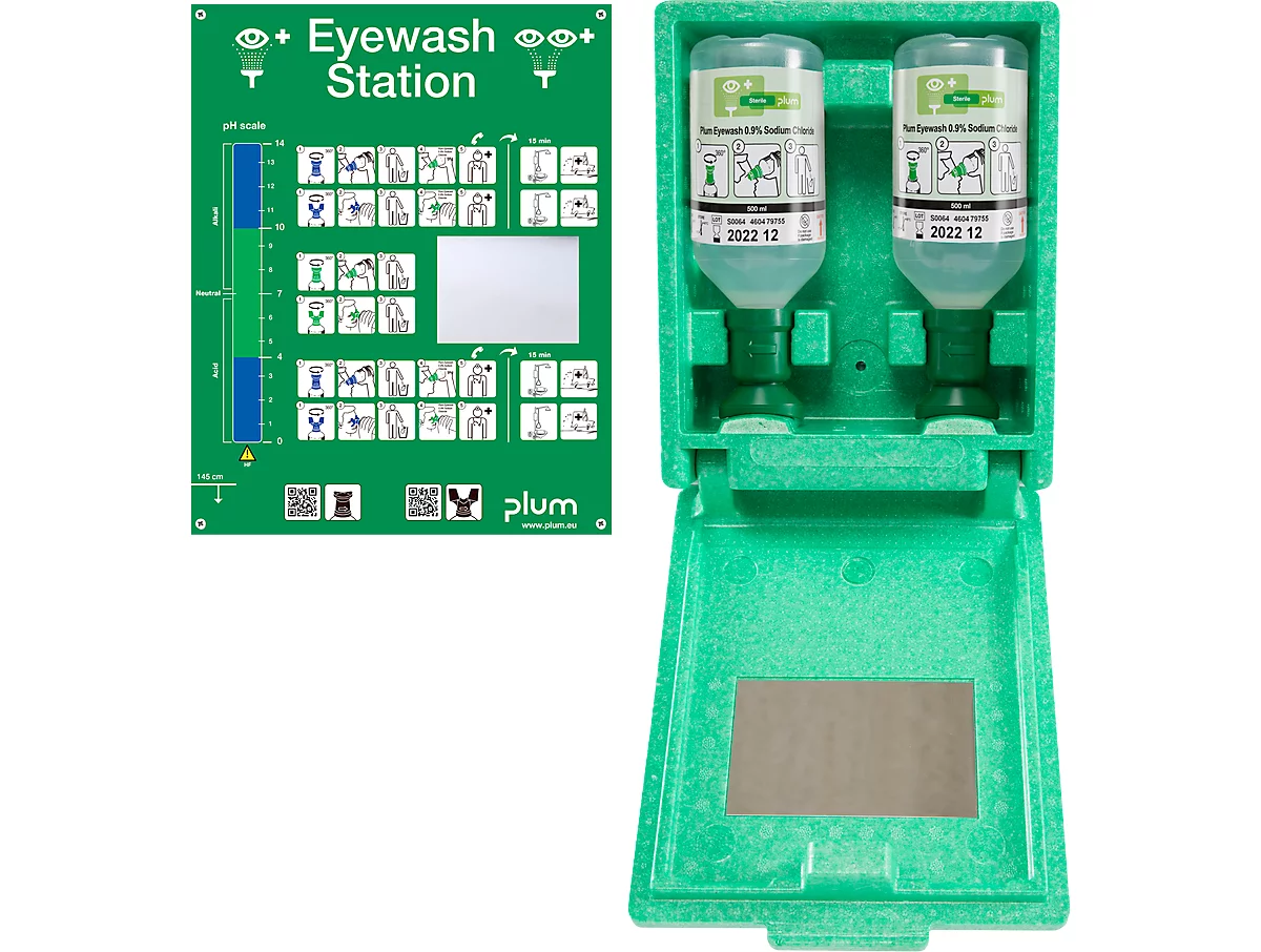 Staubdichte Wandbox aus Polystyrol mit 2 Flaschen à 500 ml, Augenspülkennzeichnung und Spiegel. Besonders für den Einsatz an Arbeitsplätzen geeignet, wo Staub und Schmutz anfallen. Im Erste-Hilfe-Fall sehr leicht und schnell zu öffnen.