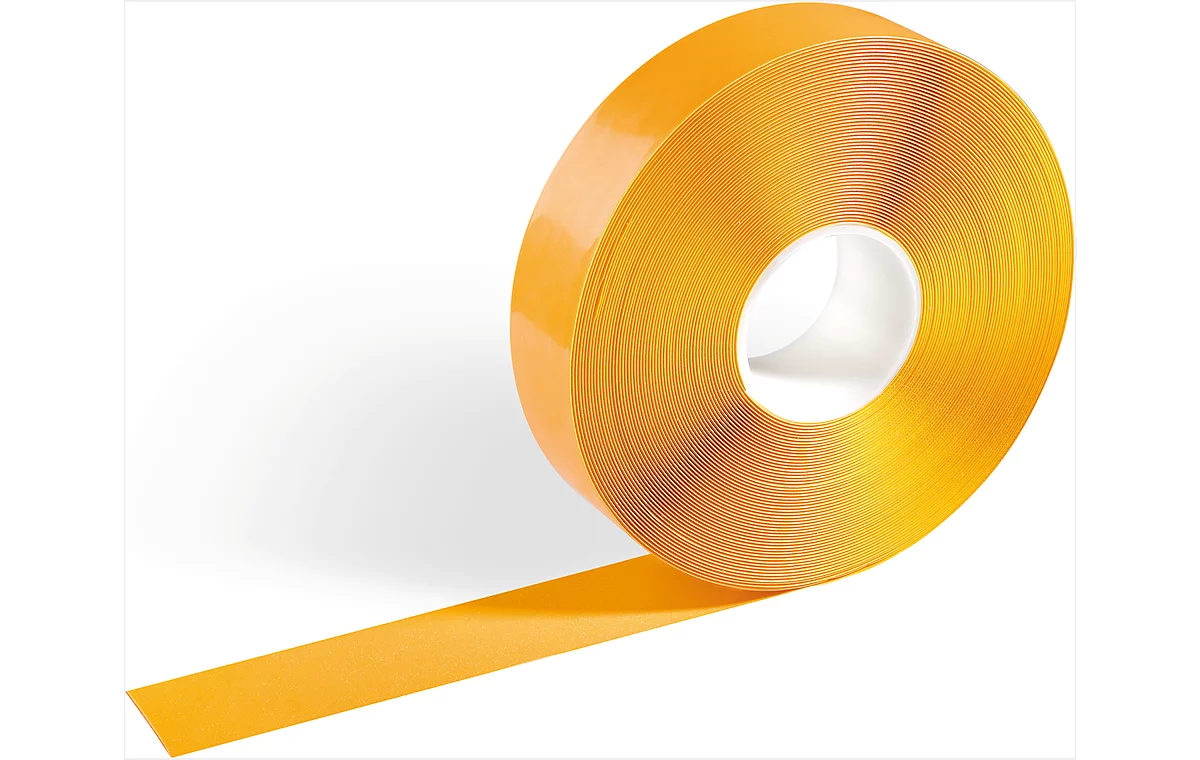 Dieses Bodenmarkierungsband von Durable ist einfarbig, selbstklebend und besitzt abgeschrägte Kanten für eine hohe Belastbarkeit. Diese verhindern zudem eine Beschädigung beim Überfahren des Bandes, beispielsweise mit einem Stapler.