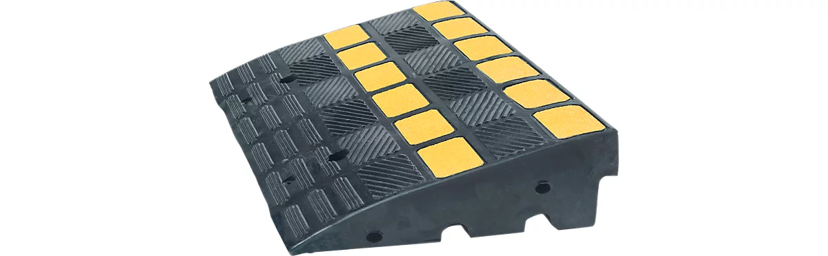 Bordsteinrampe aus robustem Hartgummi für barrierefreien Zugang an Bürgersteigen und Absätzen. Im gewerblichen Bereich (Hubwagen, Sackkarren etc.) einsetzbar. Für Haus- und Garagen-Einfahrten (Kfz-Verkehr, Fahrräder, Rollstühle, Schubkarren etc.). Die profilierte Antirutschoberfläche und gelbe Reflexstreifen sorgen für optimale Sicherheit. Die beiden Aussparungen am Boden ermöglichen das Abfließen des Regenwassers. Auch als Kabelkanäle nutzbar. Dauerhafte Fixierung durch integrierte Dübelaufnahmen möglich.