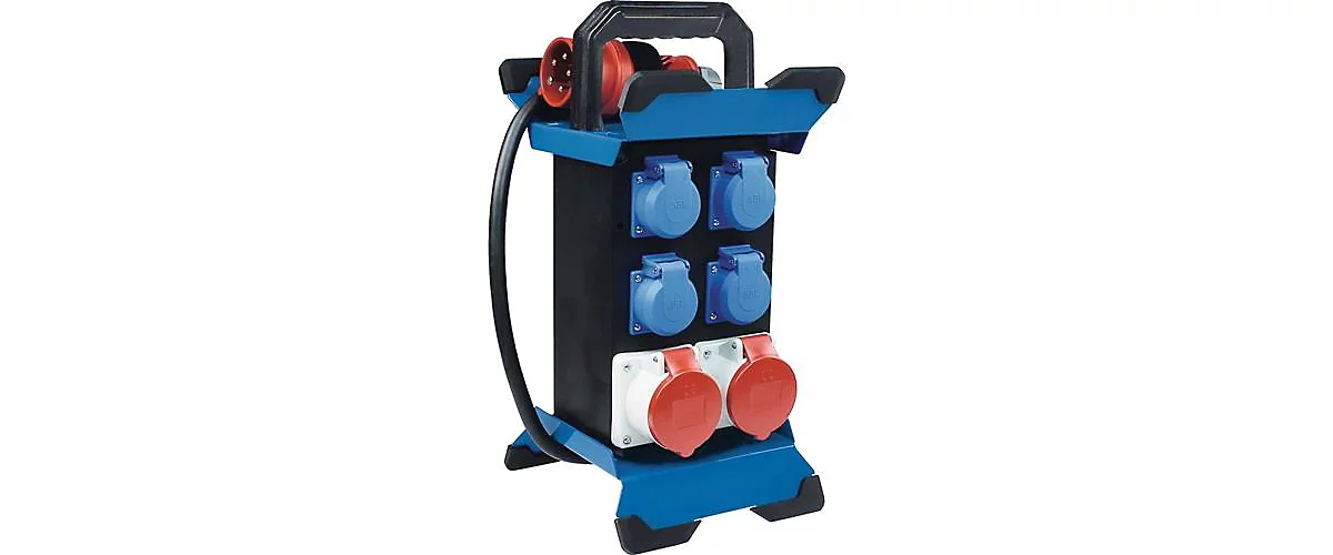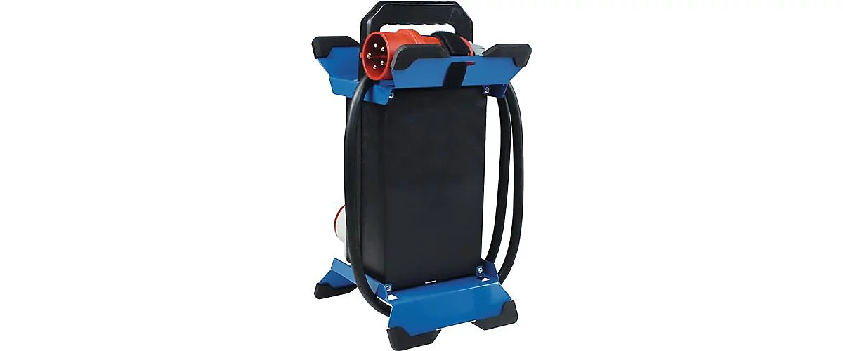 robustes Gehäuse aus hochbruchfestem Spezialkunststoff · stabiles Metallgestell mit Kantensschutz · mit großem, ergonomischem Tragegriff und Kabelaufwickler · Abmessungen (BxHxT): 230x417x220 mm · geprüft nach DIN VDE 0620-1, IEC 60309, EN 61439-4, DIN EN 50525-2 · fremdkörper und spritzwassergeschützt, zur dauerhaften Verwendung im Außenbereich geeignet · IP44