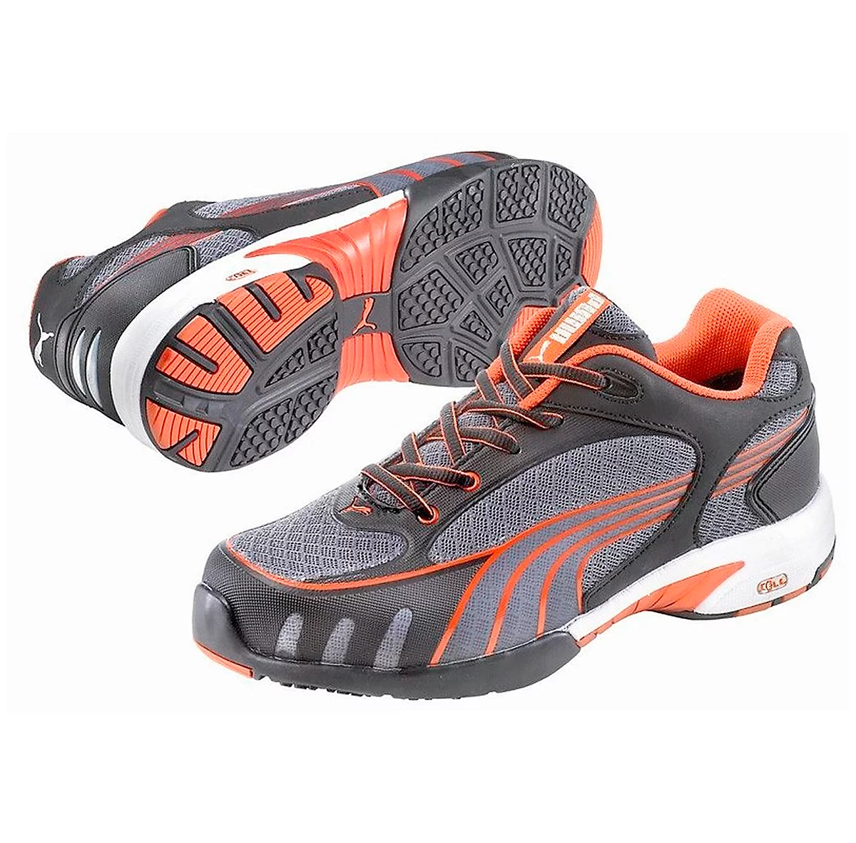 Die beliebten Sicherheitsschuhe von PUMA sind in sportlichem Design gehalten und bestehen aus atmungsfähigem Textilgewebe. Ihre Farben Schwarz, Grau und Orange sind leicht zu kombinieren.