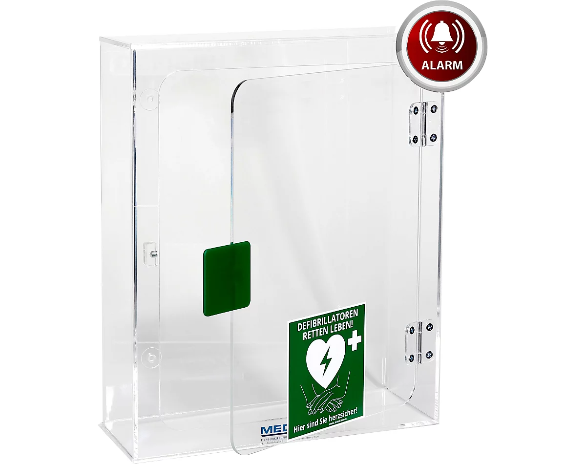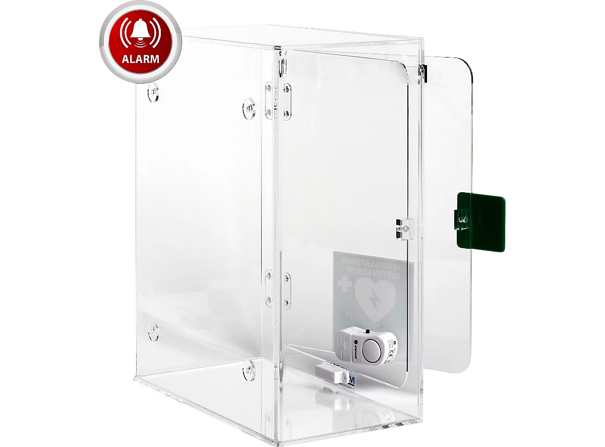 Defibrillatoren retten Leben und sind aus diesem Grunde von enormer Wichtigkeit, da hier Sekunden über Wohl und Wehe entscheiden. Der Defibrillator-und AED Wandkasten aus dem Schäfer Shop ist für den Innenbereich gedacht und verfügt über einen 100 dB lauten akustischen Alarm, um auf sich aufmerksam zu machen. Die Fronttür ist mit einem Magnetverschluss versehen und die Scharniere sind verstärkt. Der Defibrillator-Wandkasten ist „made in Germany“ und verfügt über einen Standortaufkleber, der sich überall anbringen lässt.