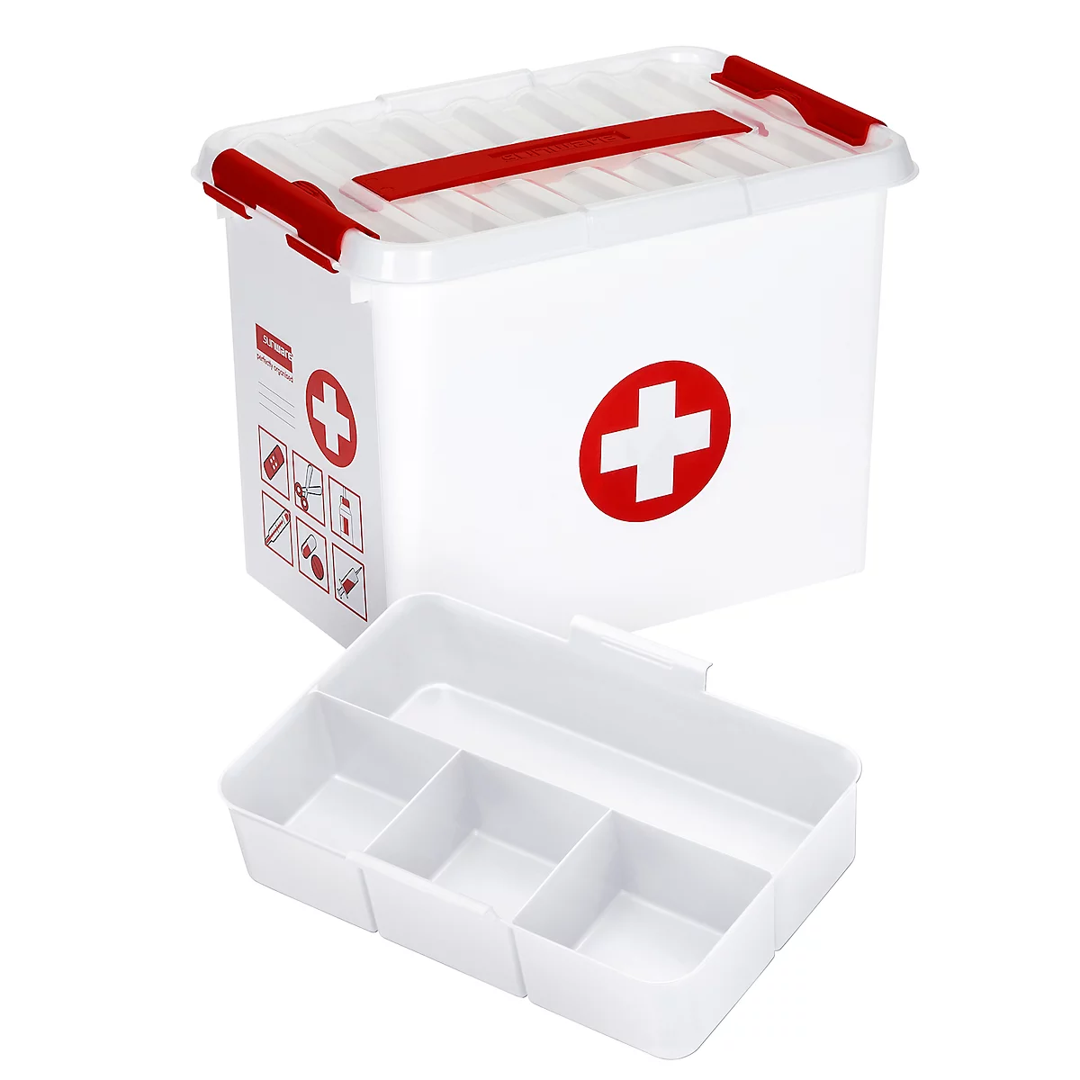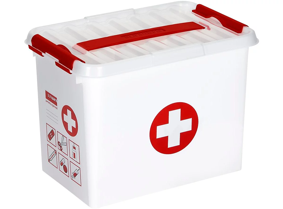 Mit der Aufbewahrungsbox Q-Line First Aid von Sunware haben Sie bei einem Missgeschick immer ein Pflaster griffbereit. Die meistgebrauchten Arzneimittel können ordentlich in die Fächer des Einsatzkastens sortiert werden, während unterhalb des Kastens die restlichen medizinischen Hilfsmittel genügend Platz finden. Stabile Verschlussclips sorgen für eine staubfreie und feuchtigkeitsgeschützte Aufbewahrung des Inhaltes. Zudem lassen sich die Boxen problemlos stapeln.