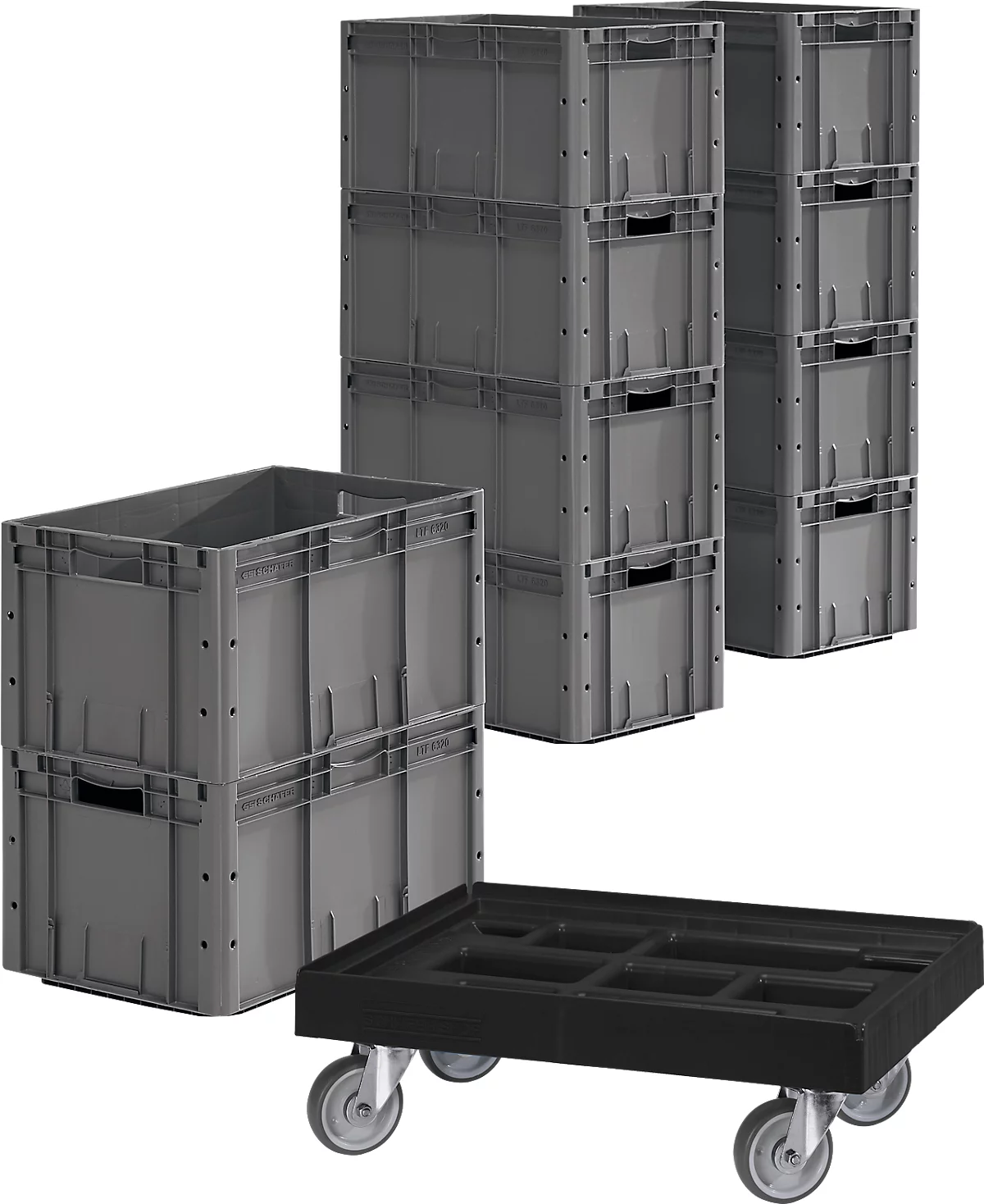 Sie erhalten diese mit 3 Jahren Garantie versehene Euro Box der Serie LTF 6320 zu jeweils 10 Stück. Darüber hinaus ist im Lieferumfang ein hochqualitativer Rollrahmen aus stabilem Kunststoff gratis mit inbegriffen. Dieser ist für den Transport von Behältern der Größe von L 600 x B 400 mm geeignet und ruht auf 4 Lenkrollen aus Polypropylen mit einem Durchmesser von jeweils 100 mm. Mit dem Rollrahmen lassen sich Lasten von bis zu 300 kg Gewicht mühelos und rückenschonend an den Bestimmungsort bringen.