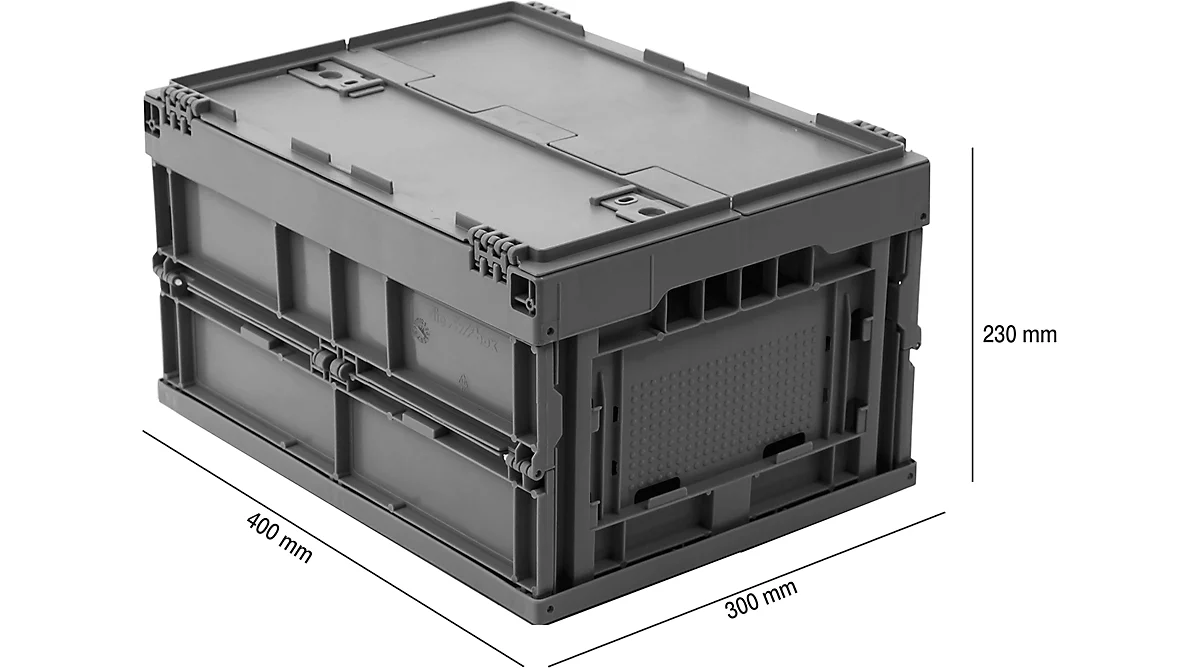 Die EURO-Maß Faltbox 4322 DL wird mit Deckel geliefert und bietet einen Inhalt von 19 Litern. Dabei eignet sich die EURO-Maß Faltbox 4322 DL besonders für den Einsatz in der Lager- und Mehrwegtransport-Logistik.