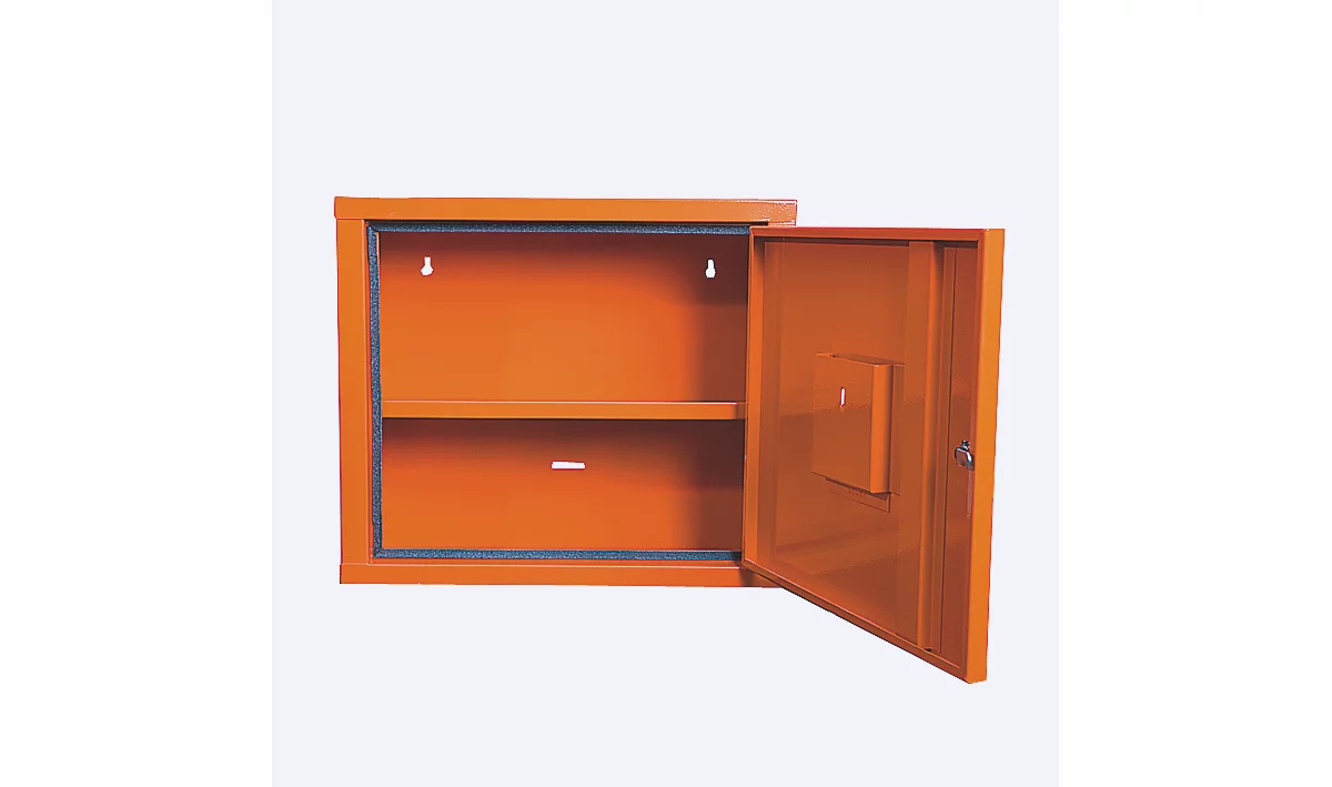 Qualitäts-Feinblech, Tür stumpf einschlagend, stabiles Stangenscharnier, umlaufende Profilgummidichtung. Sicherheitsschloss mit zwei Schlüsseln, Notschlüsselfach in der Tür.