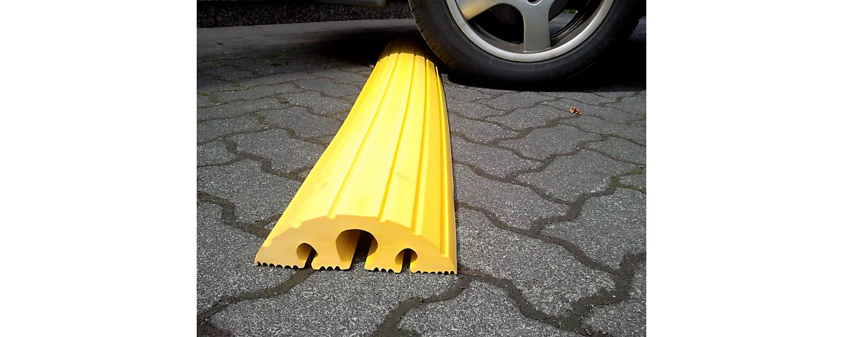 Diese praktische Kabelbrücke erlaubt das sichere Verlegen von Kabeln überall dort, wo Verkehr mit schweren Kraftfahrzeugen herrscht. Das kann zum Beispiel auf Parkplätzen oder viel befahrenen Straßen der Fall sein. Die Kabelbrücke ist dank der Fertigung aus PVC äußerst stabil und erreicht eine Belastbarkeit bis zu 30 Tonnen. Selbst schwere Fahrzeuge können die Brücke passieren, ohne die darunter verlegten Kabel oder Leitungen zu beschädigen. Eine Verwendung mit Kettenfahrzeugen ist jedoch nicht vorgesehen.