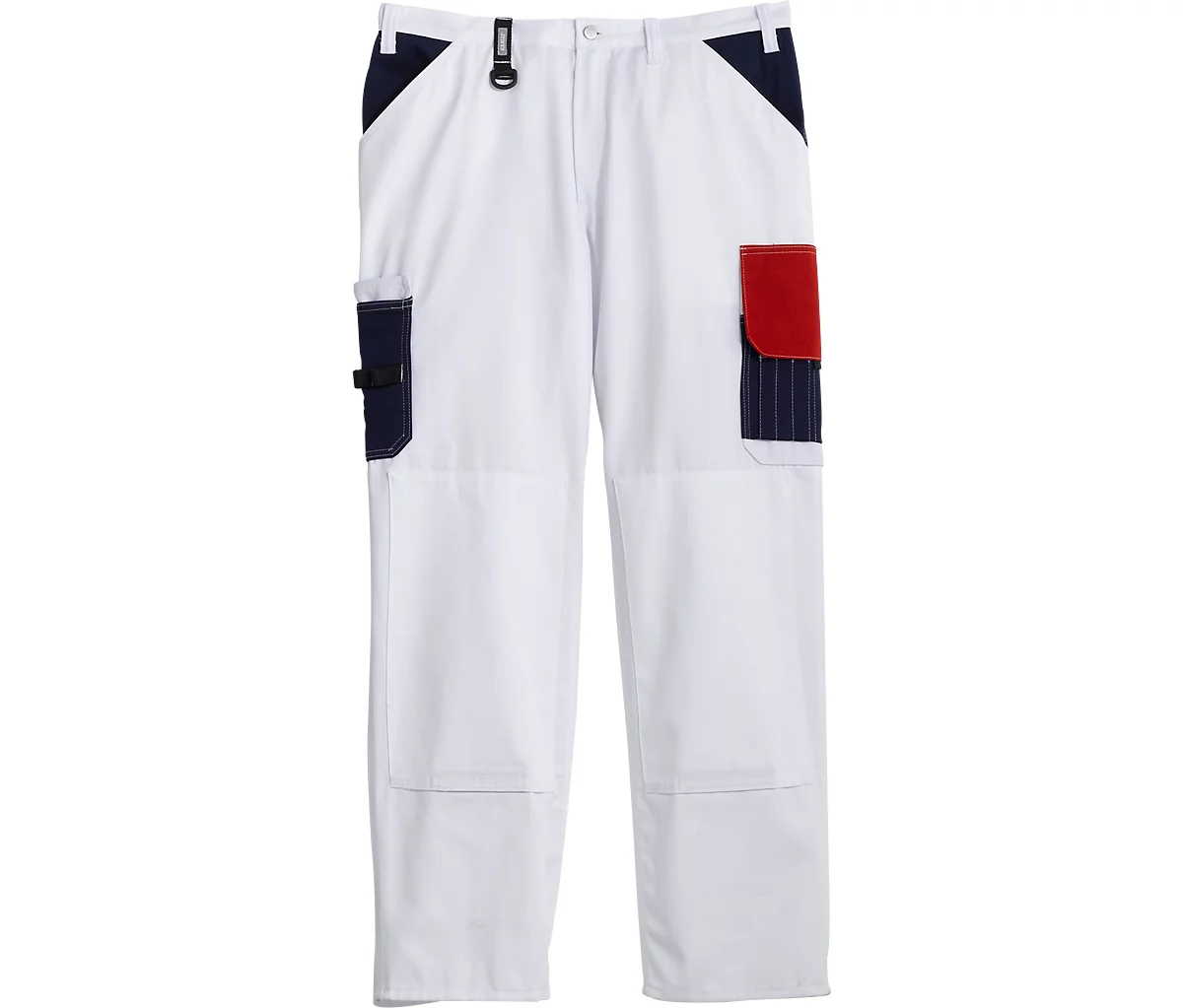 2 Seitentaschen, 2 Gesäßtaschen mit Patte. 2 doppelte Oberschenkeltaschen, links mit Patte. 1 lose hängende Zollstocktasche. Knietaschen zur Aufnahme von Knieschutzpolstern.