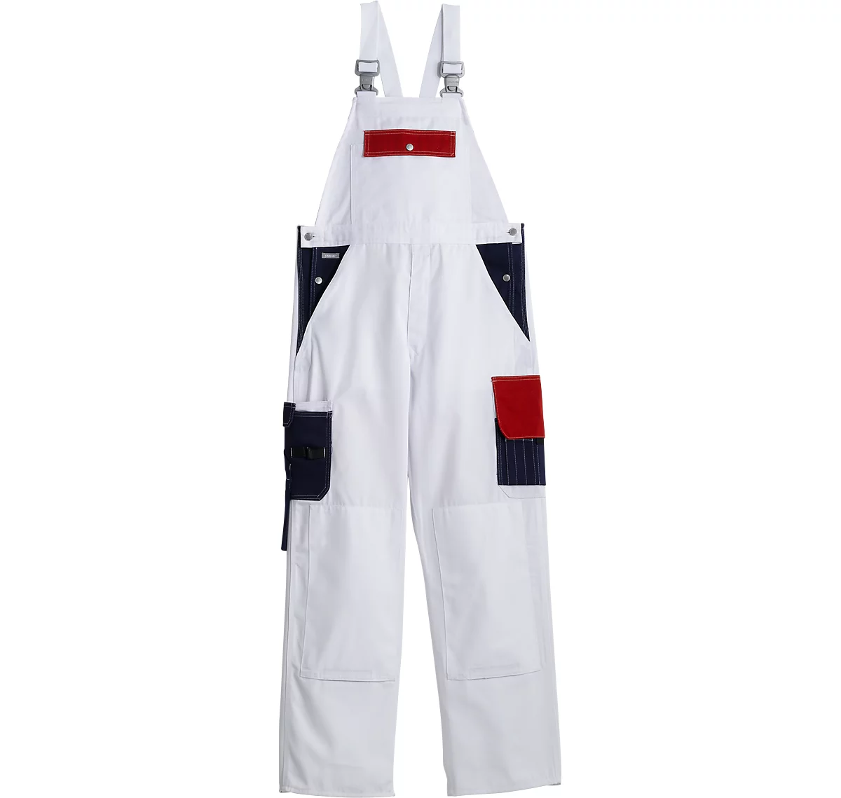 Mit hochgezogenem Rückenteil und verstellbarem Bund. 2 Seitentaschen, 2 Gesäßtaschen mit Patte. 2 doppelte Oberschenkeltaschen, links mit Patte. 1 lose hängende Zollstocktasche. Knietaschen zur Aufnahme von Knieschutzpolstern.