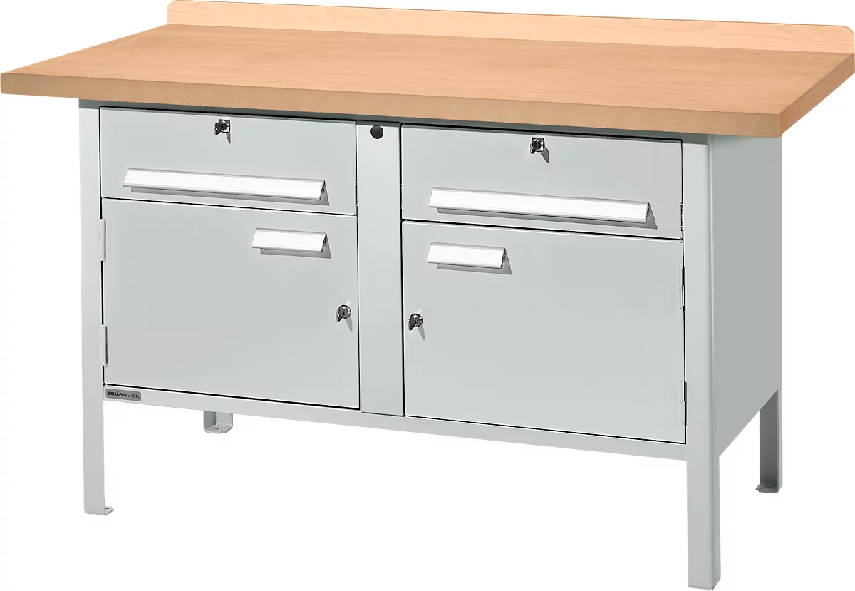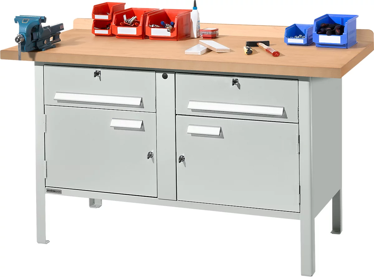Die Werkbank besitzt zwei 360 mm hohe Schrankelemente mit innenliegenden Flügeltüren und zwei Schubladen, die sich auf zwei per Zylinderschloss abschließbare Abteile verteilen. Verstauen Sie Ihre Arbeitsausstattung in 4 geschlossene Fächer, die sich durch zwei herausnehmbare Fachböden aufgliedern. Einen Fachboden beladen Sie mit bis zu 50 kg Gewicht.