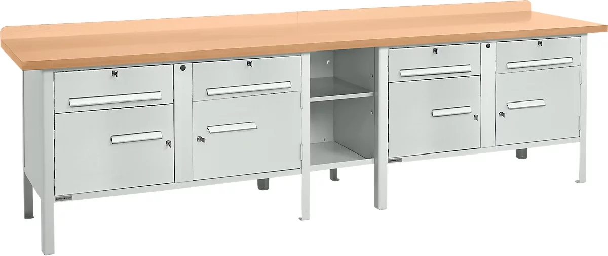 Der Unterbau setzt sich zusammen aus zwei Abteilen, insgesamt vier 360 mm hohen Schrankteilen und vier Schubladen. Die Elemente der Werkbank sind über ein Zylinderschloss verschließbar. Die Schrankteile besitzen innenliegende Flügeltüren. 2 offene und 8 geschlossene Fächer mit fünf einlegbaren Fachböden unterstützen Sie bei der Ablage Ihrer Arbeitsmittel. Jeder Fachboden ist mit bis zu 50 kg belastbar.