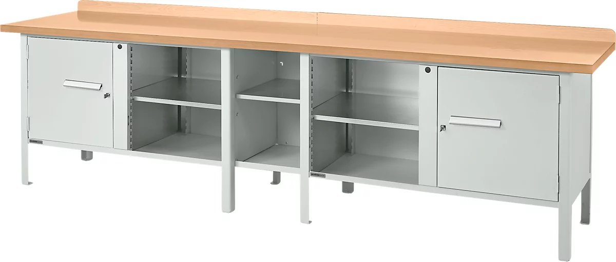 Im Unterbau der Werkbank finden Sie auf fünf Abteile verteilt Stauraum in zwei 540 mm hohen Türschränken, sich über ein Zylinderschloss zuschließen lassen. Die innenliegenden Flügeltüren sind bündig zum Korpus ausgeführt. Nutzen Sie für die Aufbewahrung Ihres Arbeitsmaterials 6 offene und 4 geschlossene Fächer – durch fünf herausnehmbare, bis zu 50 kg beladbare Fachböden bleiben Sie dabei flexibel.