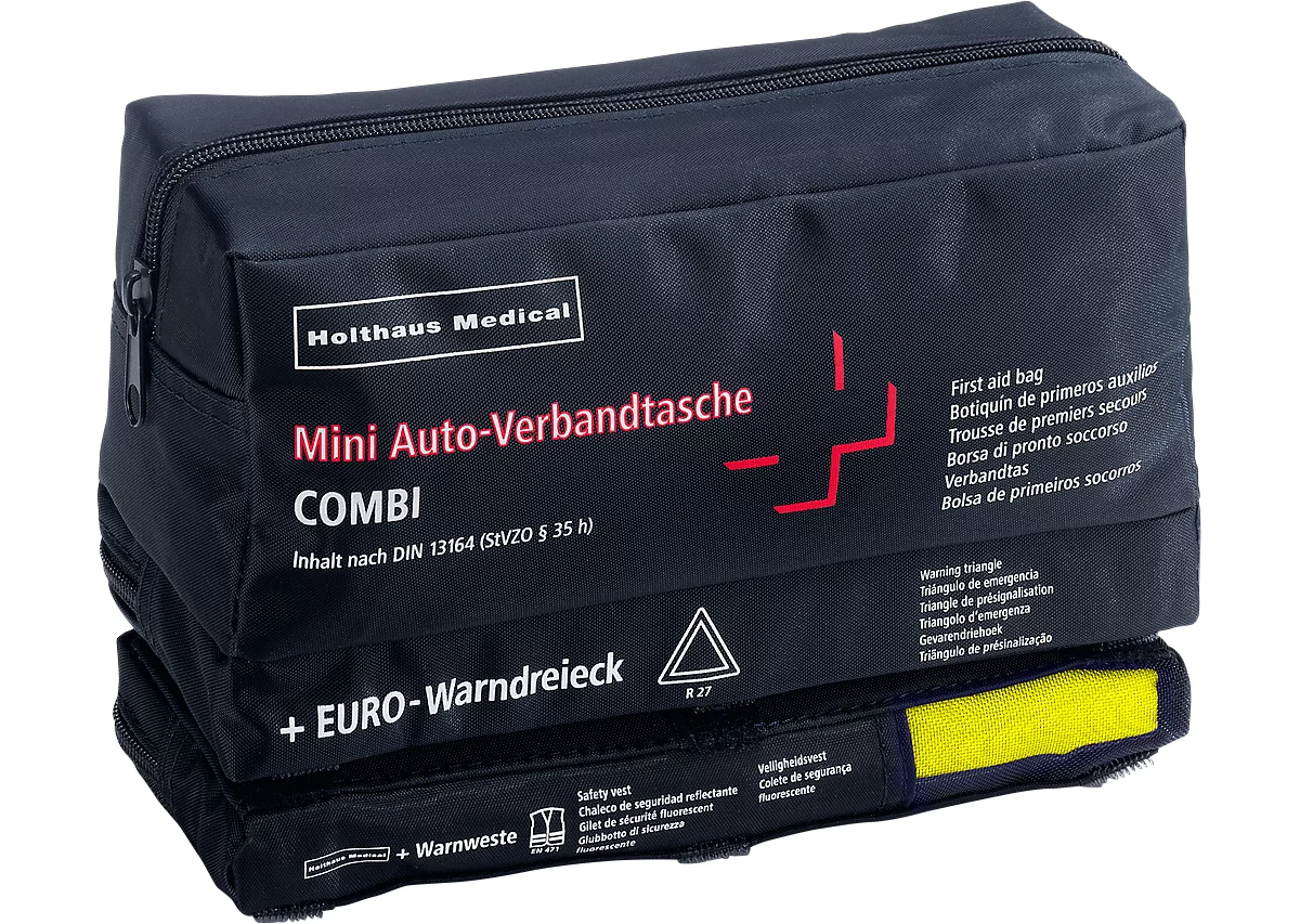 Tasche aus Nylon, mit Reißverschluss und 2 Klettbändern zur Fixierung im Kofferraum. Inhalt nach DIN 13164 sowie Warndreieck nach ECE-Richtlinie und Warnweste aus 100% Polyester nach ISO 20471 Klasse 2.