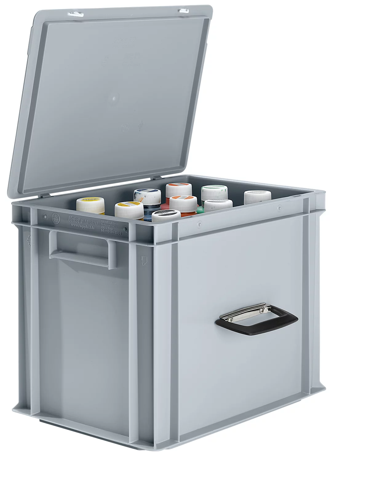 Stoßfester und sehr robuster Koffer, beständig gegen Öle, Lösungsmittel und viele Säuren. Organisierbar mit Einsatzkästen (optional). Temperaturbeständig von -40° bis +75° C. Spülmaschinenfest. Selbstverriegelnde Verschlüsse. Ein Griff ist immer an der Längsseite montiert. Der Koffer kann jedoch auf Wunsch um zusätzliche Griffe ergänzt werden. Preis für Zusatzgriffe auf Anfrage.
