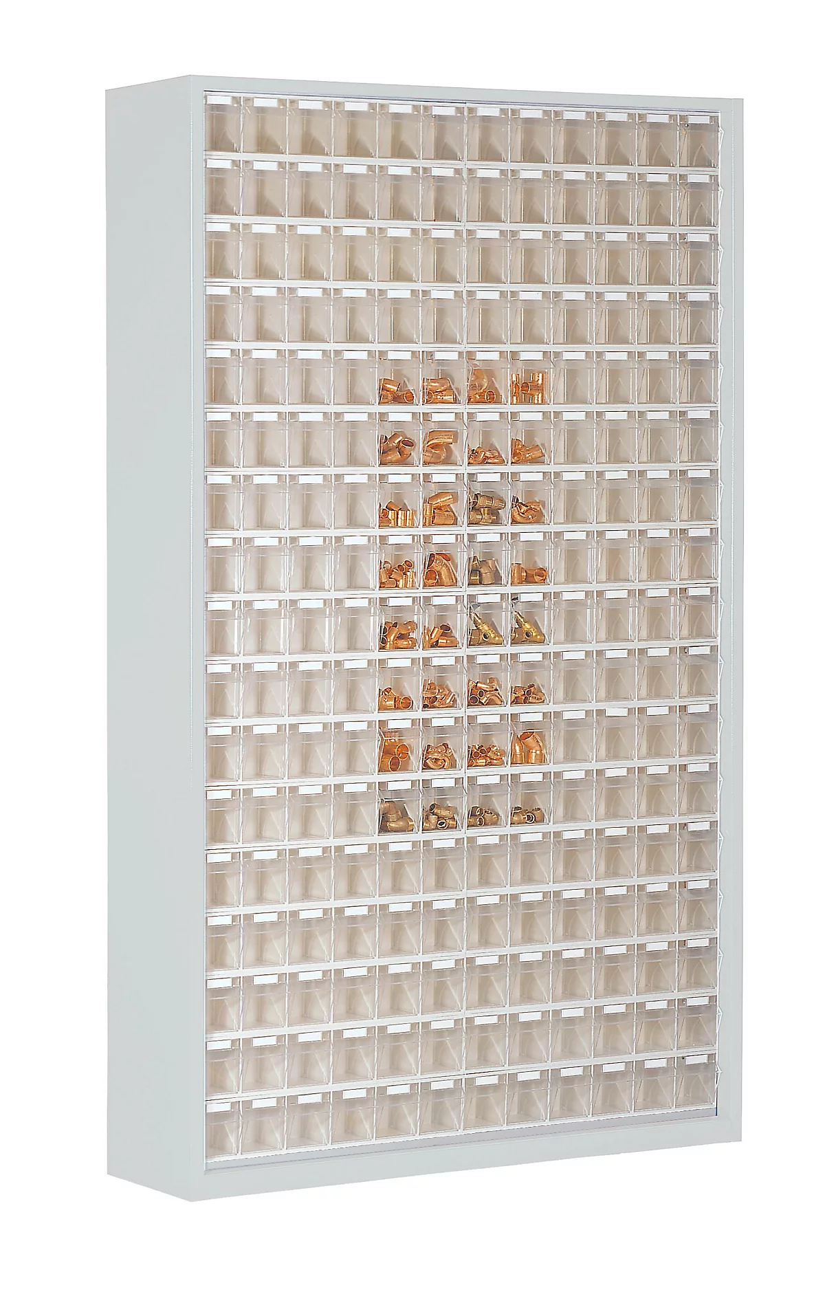 Für die übersichtliche und staubfreie Aufbewahrung von Kleinteilen und Zubehör ist dieser Magazinschrank mit einem Fassungsvermögen von insgesamt 635 l ideal. Gefertigt aus pulverbeschichtetem Stahlblech, unterstützt er zielgerichtet in Industrie und Werkstatt, in Laboren und Praxen, medizinischen Einrichtungen oder Verkaufsräumen.