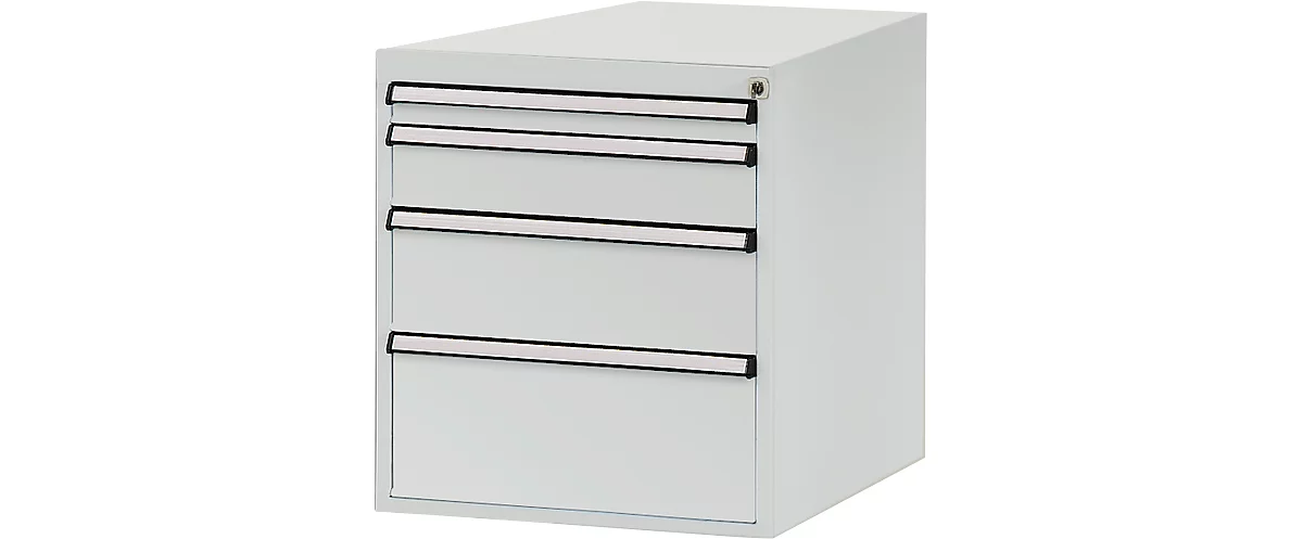 Mit den Manuflex Schubladen-Unterbauten schaffen Sie mehr Ordnung und Übersicht am Arbeitsplatz. Passend für Tischtiefen von 800 mm oder 1000 mm lassen sich die Manuflex Schubladen-Unterbauten perfekt unter die UNIVERSAL Arbeitstische von Manuflex einsetzen. In dieser Ausführung bietet Ihnen der Schubladen-Unterbau vier Schubfächer. Diese sind je 50 mm, 100 mm, 150 mm und 200 mm hoch bei einer Gesamt-Nutzhöhe von 500 mm. Die Schubfächer sind mit 35 kg belastbar und ausgestattet mit einer großen Griffleiste und Etiketten zur Beschriftung. Hinzu kommt die Einzelauszugssperre, die ein unbeabsichtigtes, gleichzeitiges Öffnen der Schübe verhindert und somit die Quetsch- und Verletzungsgefahr reduziert. Die Manuflex Schubladen-Unterbauten bestehen aus einer massiv verstärkten Stahlblechkonstruktion und sind ausgestattet mit einem Zylinderschloss mit Zentralverrieglung. Zwei Schlüssel werden mitgeliefert. Auf Anfrage können wir Ihnen die Manuflex Schubladen-Unterbauten auch in einer leitfähigen Ausführung liefern.