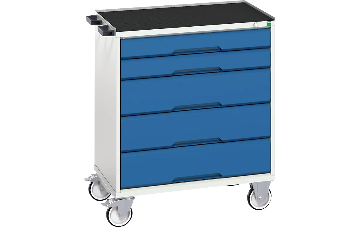 Dieser durchdachte Werkzeugschrank hat fünf Schübe, welche bis zu einem Höchstgewicht von 50 Kilogramm je Schublade belastbar sind. Jede Schublade lässt sich voll ausziehen, um Ihnen den Zugriff auf den Inhalt zu erleichtern. Der Schrank besitzt eine Zentralverriegelung für alle Schübe zur Verhinderung eines unberechtigten Zugriffs. Es stehen zwei Modellvarianten mit den Breiten 800 oder 1050 mm zur Wahl. Die Tiefe des Schranks beträgt 550 mm, seine Höhe 965 mm.