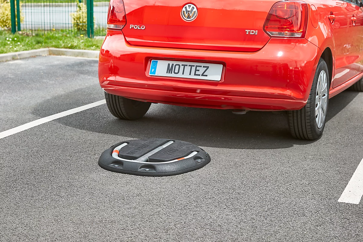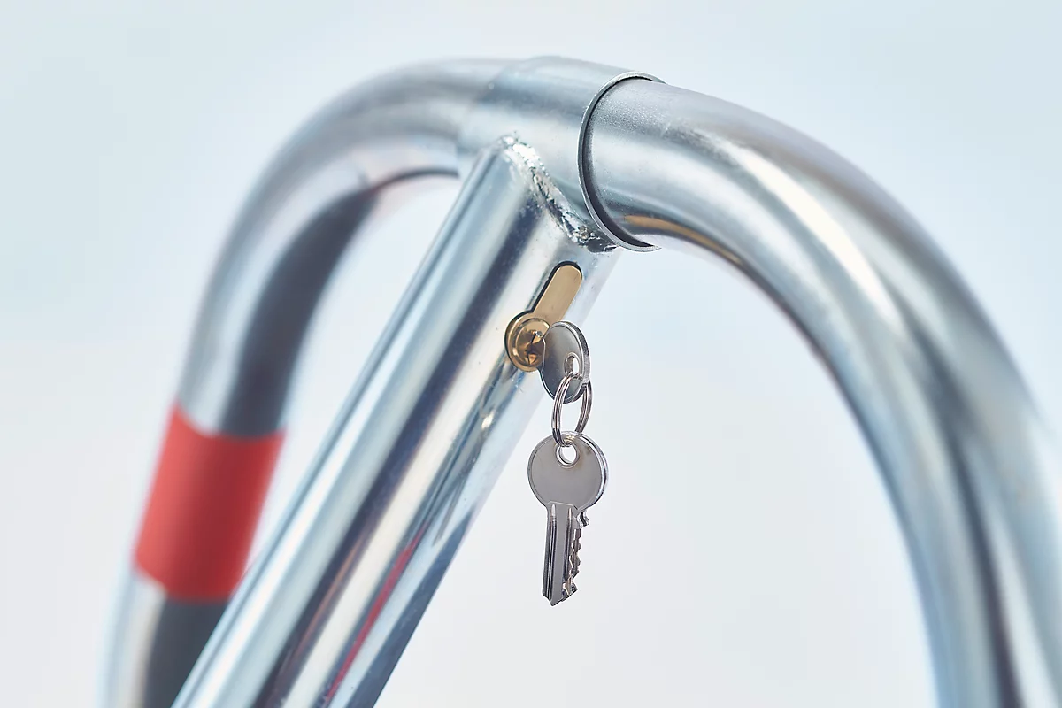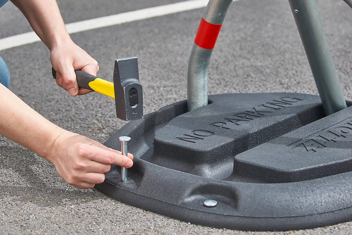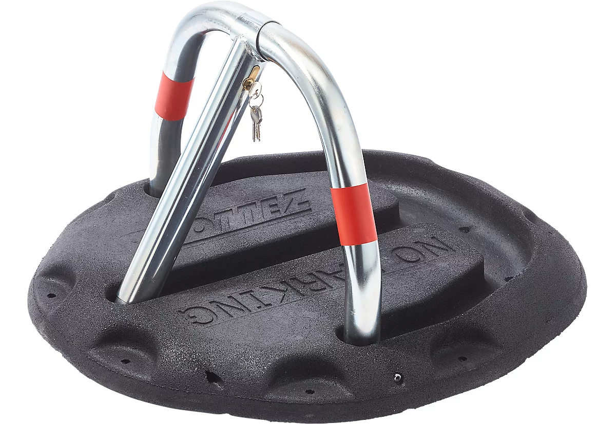 Der Mottez Parkplatzbügel mit Gummisockel dient der zuverlässigen Sicherung von Autostellplätzen. Er zeichnet sich durch ein besonders unkompliziertes und zeitsparendes Handling aus: Sie befestigen das Sicherungssystem schnell mit den patentierten Nägeln auf Makadam, die dafür erforderlichen Verankerungseisen sind im Lieferumfang des Artikels enthalten. Der Nutzer erhält zwei ebenfalls mitgelieferte Schlüssel für ein leicht zu betätigendes europäisches Zylinderschloss.