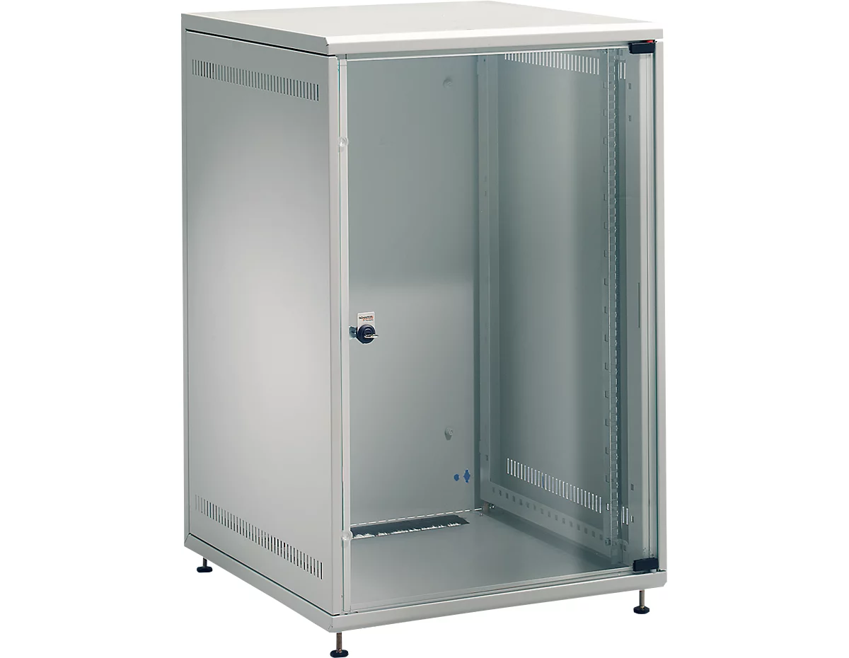 Für die Standmontage kleinerer Netzwerke, Unterverteilungen und Etagenverteiler. Nach Aufschließen der Tür können die Seitenwände einfach nach vorne herausgezogen werden, wodurch das Gehäuse von 3 Seiten zugänglich ist.