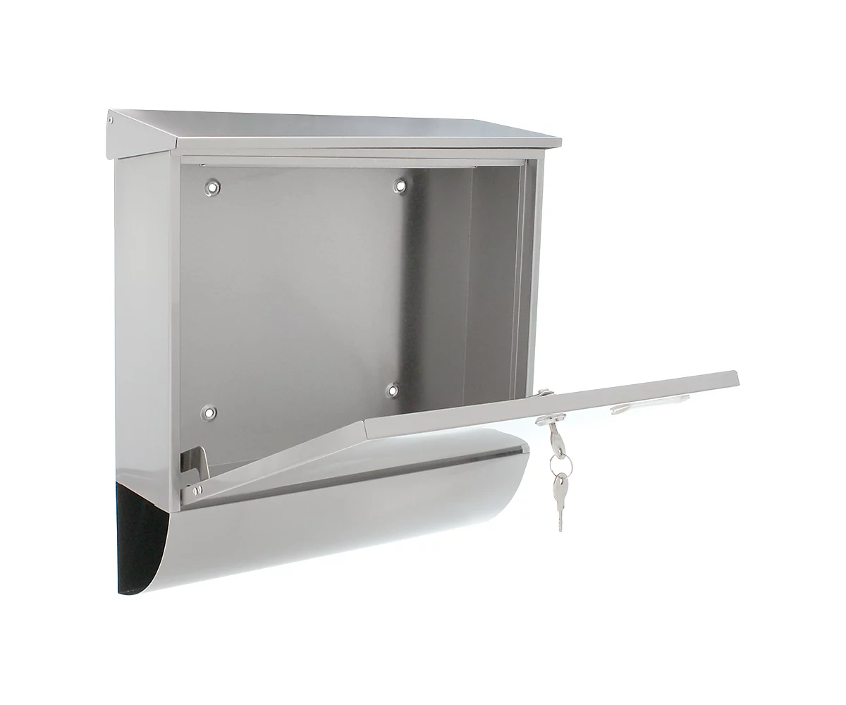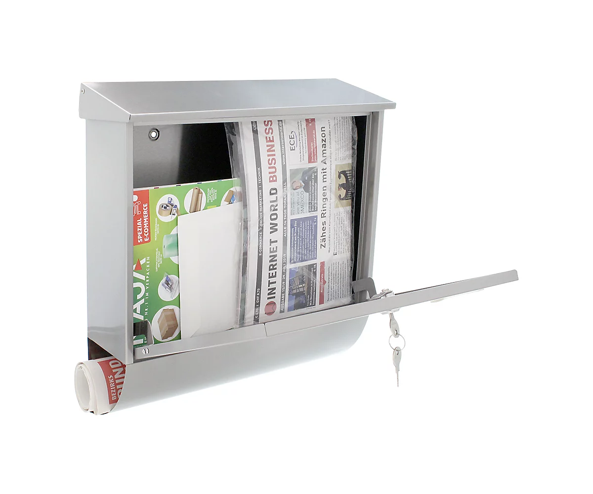 Zudem ist der Expo Inox oben rechts mit einem beschriftbarem Etikettenhalter ausgestattet, welcher als Namensschild dient. Unterhalb der nach unten öffnenden bzw. schließenden Tür befindet sich eine praktische Post- und Zeitungsrolle.