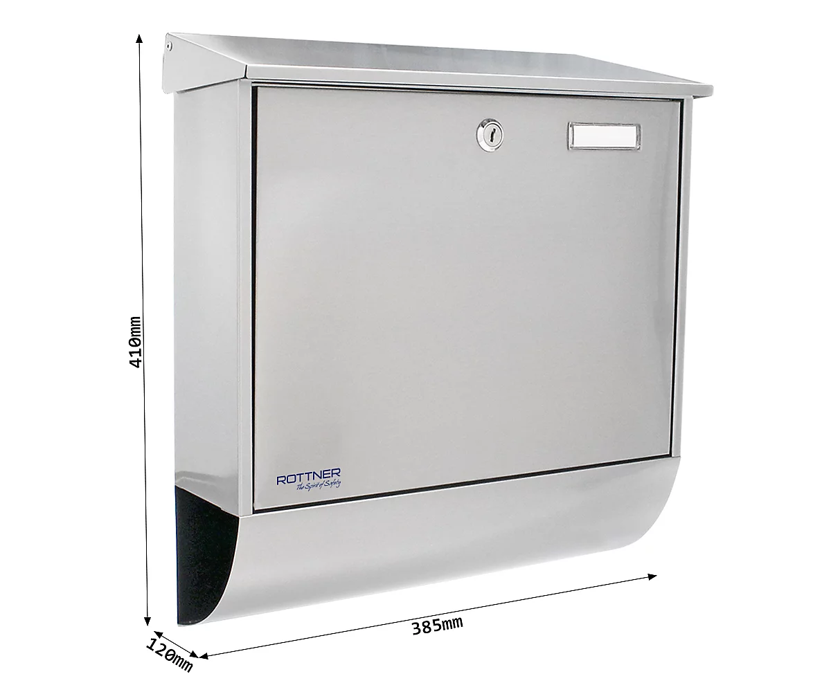 Die Außenmaße des aus rostfreiem und witterungsbeständigem Edelstahl bestehenden Briefkastens Expo Inox von Rottner betragen B 385 x T 120 x H 410 mm bei einem Gesamtgewicht von 2,5 kg.