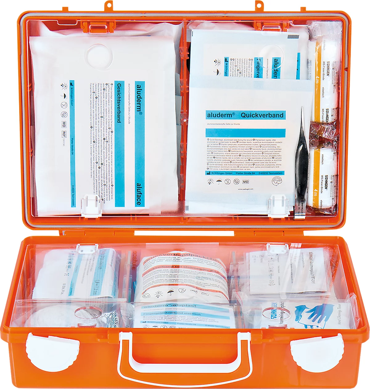 - Inhalt entsprechend DIN 13 157 und zusätzlich: WS-Netzverband, Spezial-Druckverbandpäckchen, metallisierte aluderm® Verbandstoffe