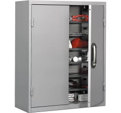 Bewahren Sie wichtige Geräte, Werkzeuge sowie Anderes in diesem Regalschrank aus robustem und pulverbeschichtetem Stahlblech mit + 25 mm Bodenausgleich griffbereit und organisiert auf. einer Breite von 545 und einer Höhe von 1950 mm bietet der Stahlschrank FS über ein kompaktes Format. Für eine platzsparende Lagerung ist er mit einer Tiefe von 520 mm ideal geeignet. 4 höhenverstellbare Fachböden mit einer Rasterhöhe von 26,5 mm unterteilen den Stauraum für eine flexible Anordnung sowie eine organisierte Ablage. Die Ablageflächen können mit bis zu 50 kg belastet werden und ermöglichen so das sichere Verstauen von Alltagswerkzeug und -geräten. Die Gesamttraglast des Regalschranks beträgt 250 kg. Setzen Sie den Regalschrank mit 5 Ordnerhöhen auch im Büro zur praktischen Unterbringung von Akten, Katalogen etc. ein. Das Lochbild im Sockelrand und Schrankboden sorgt für einen gut durchlüfteten Innenraum, um Feuchtigkeit entgegenzuwirken.