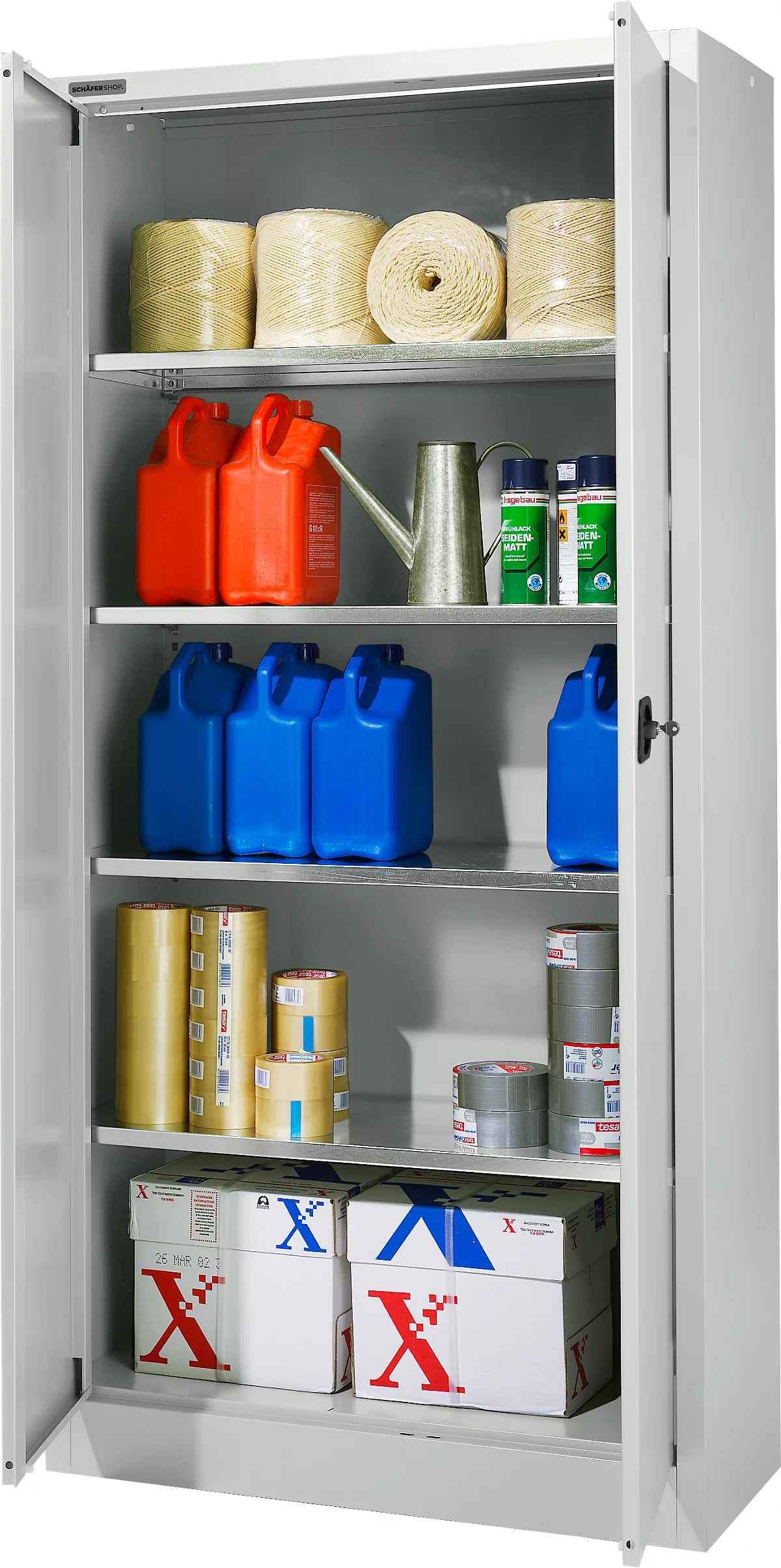 Die vier verzinkten Fachböden sind in einem Raster von 25 mm höhenverstellbar und können jeweils bis zu 50 kg an Gewicht auf. So erhalten Sie viele Optionen für eine flexible Ablage, selbst wenn es um die Anordnung sperriger oder schwerer Güter geht. Die pulverbeschichtete Oberfläche des sauber abgekanteten Flügeltürenschranks ist widerstandsfähig gegen Korrosion und Kratzer. Der Schrank ist wahlweise mit Türen in Lichtgrau oder Enzianblau verfügbar sowie in drei verschiedenen Breiten verfügbar. Dabei können Sie bei einer Höhe von 1935 mm und einer Tiefe von 400 mm zwischen den Breiten 800, 950 und 1200 mm wählen.