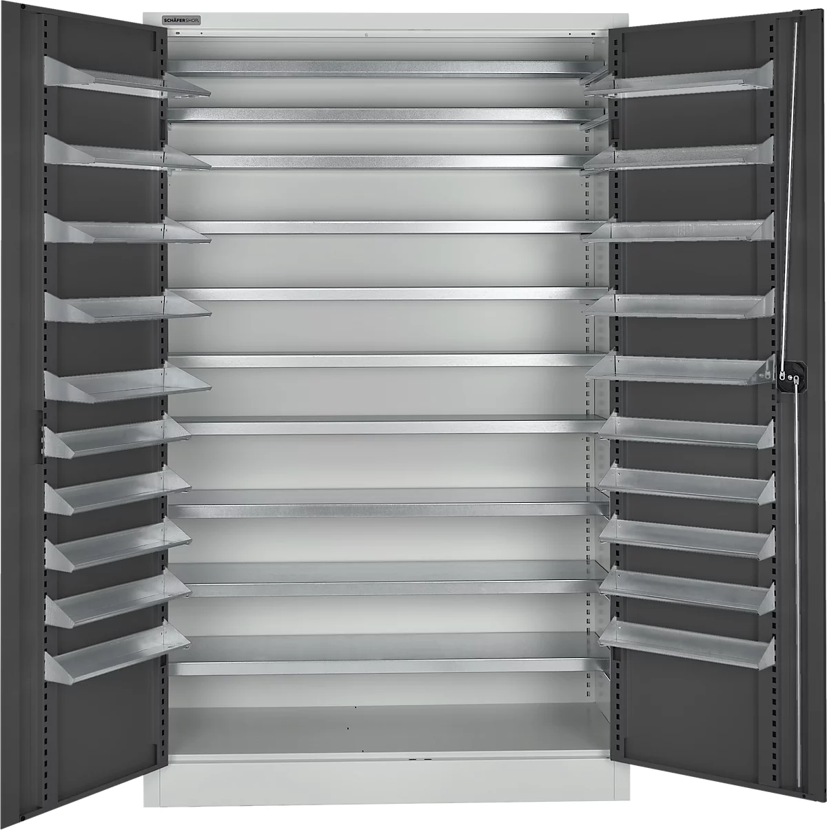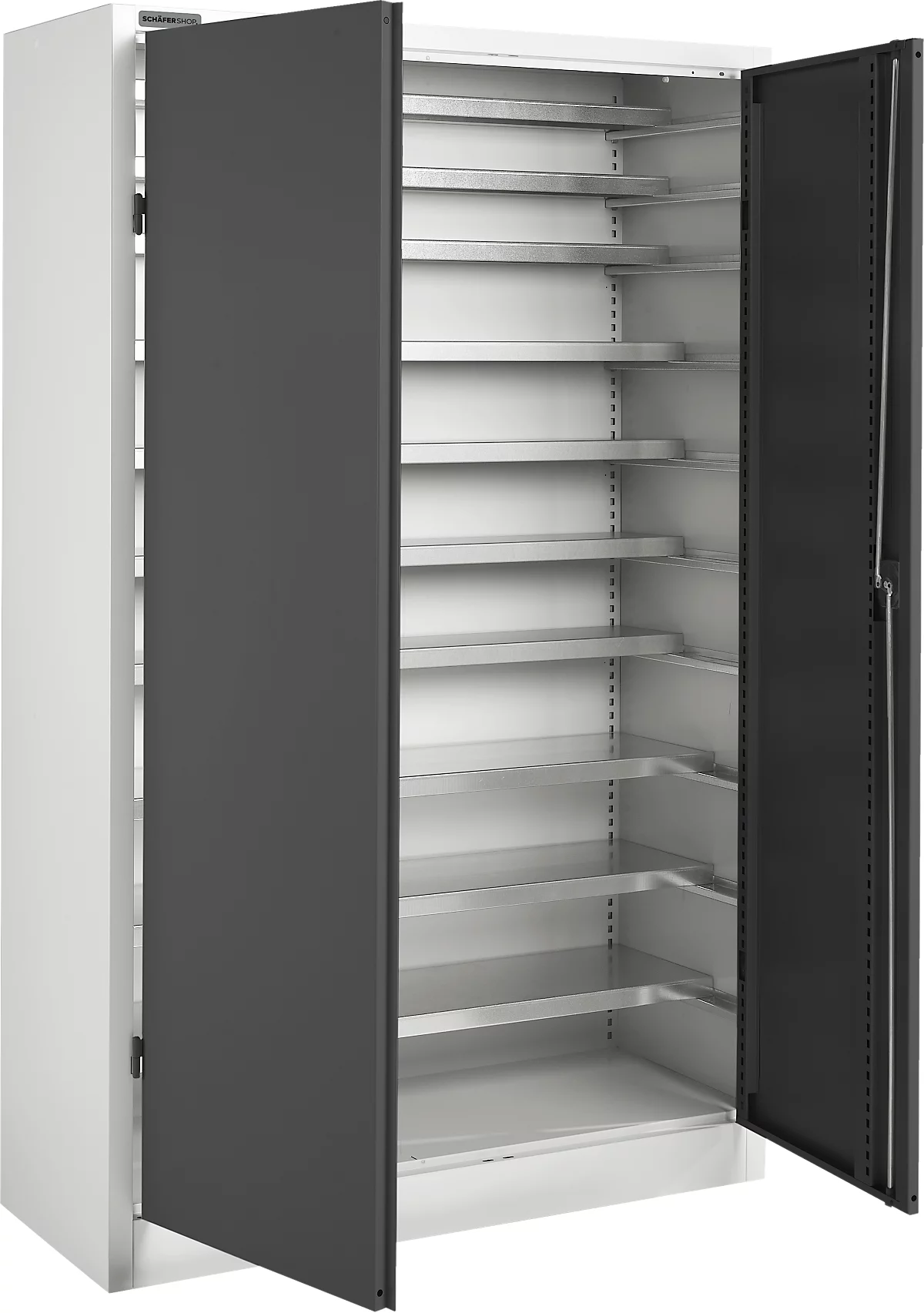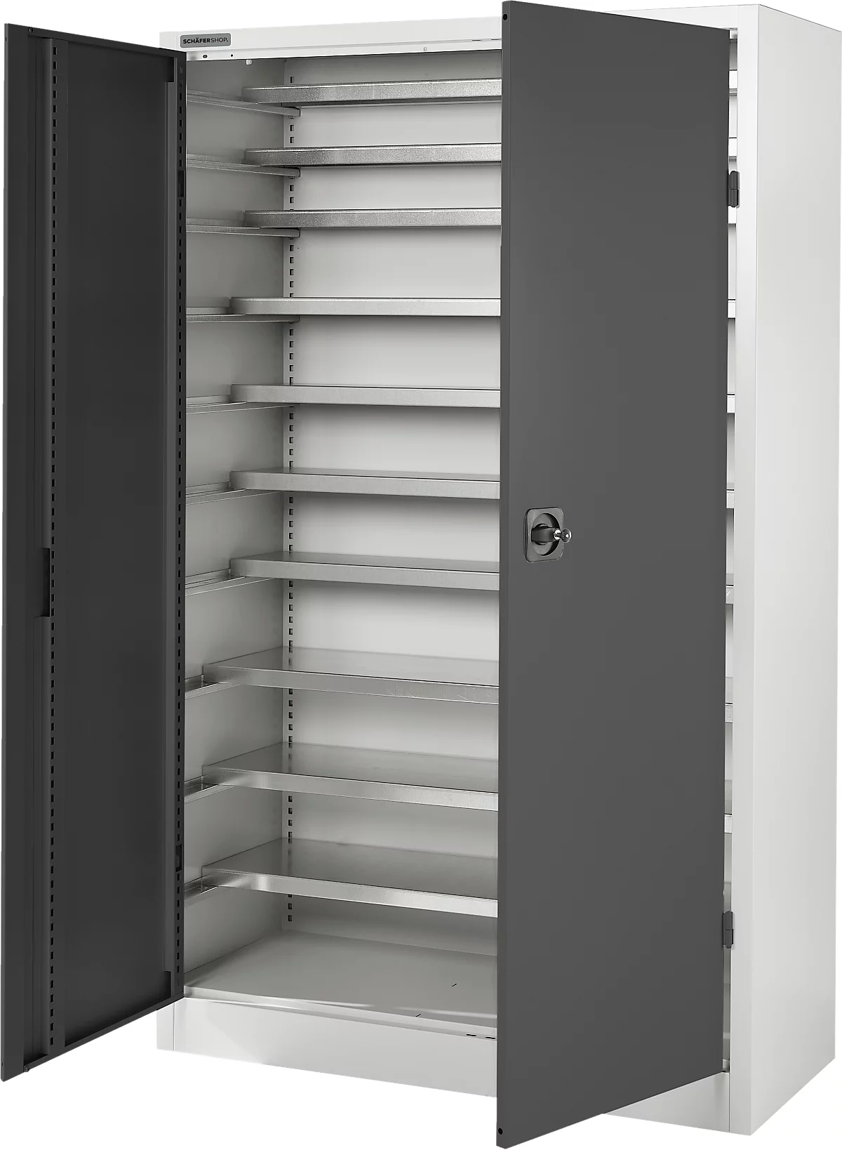 Dieser Magazinschrank von Schäfer Shop Select besitzt zehn verzinkte Einlegeböden, die jeweils bis zu 50 kg an Gewicht aufnehmen können. Um eine flexible Innenraumaufteilung zu gewährleisten, sind diese im Raster von 25 mm in der Höhe verstellbar und variieren in der Tiefe.