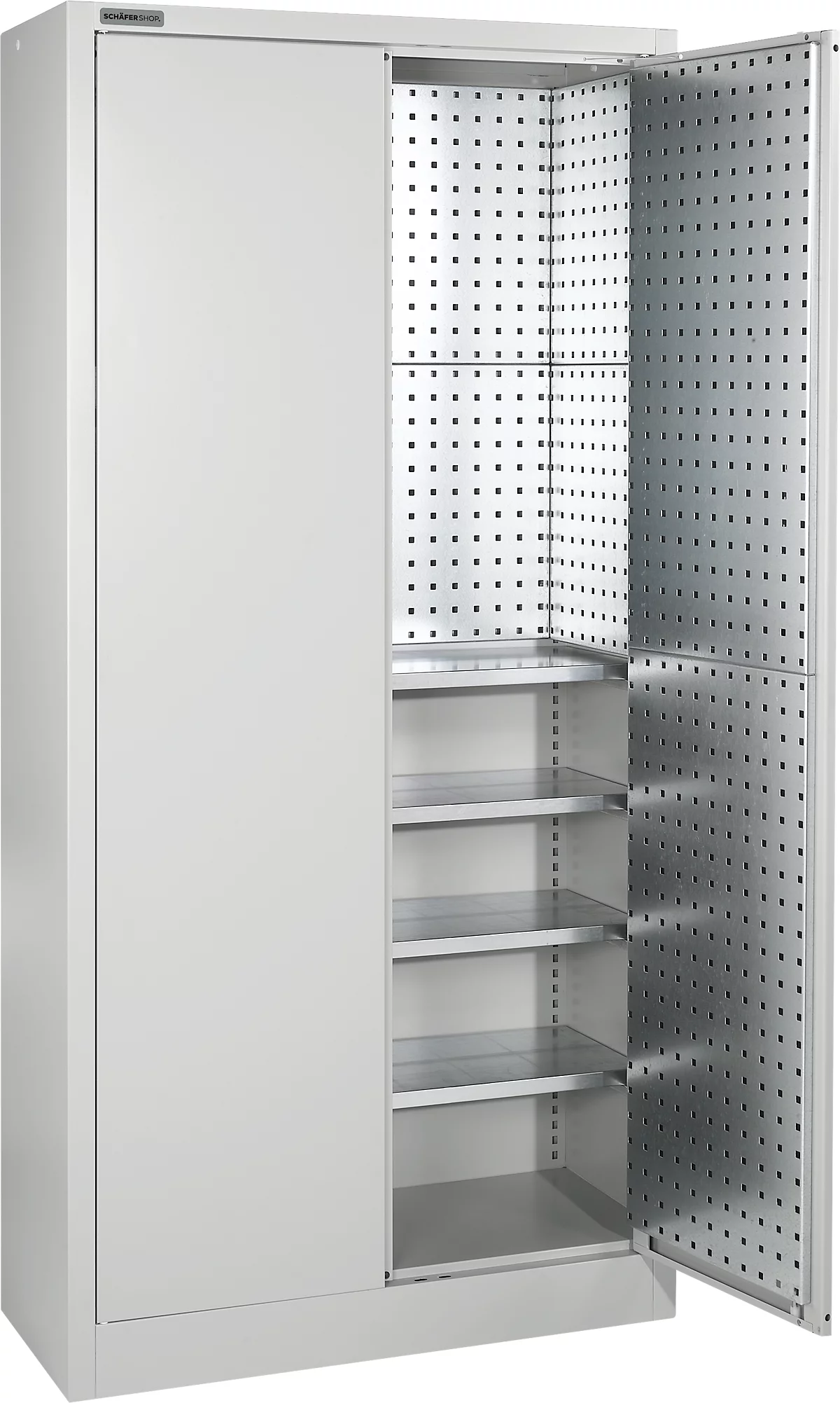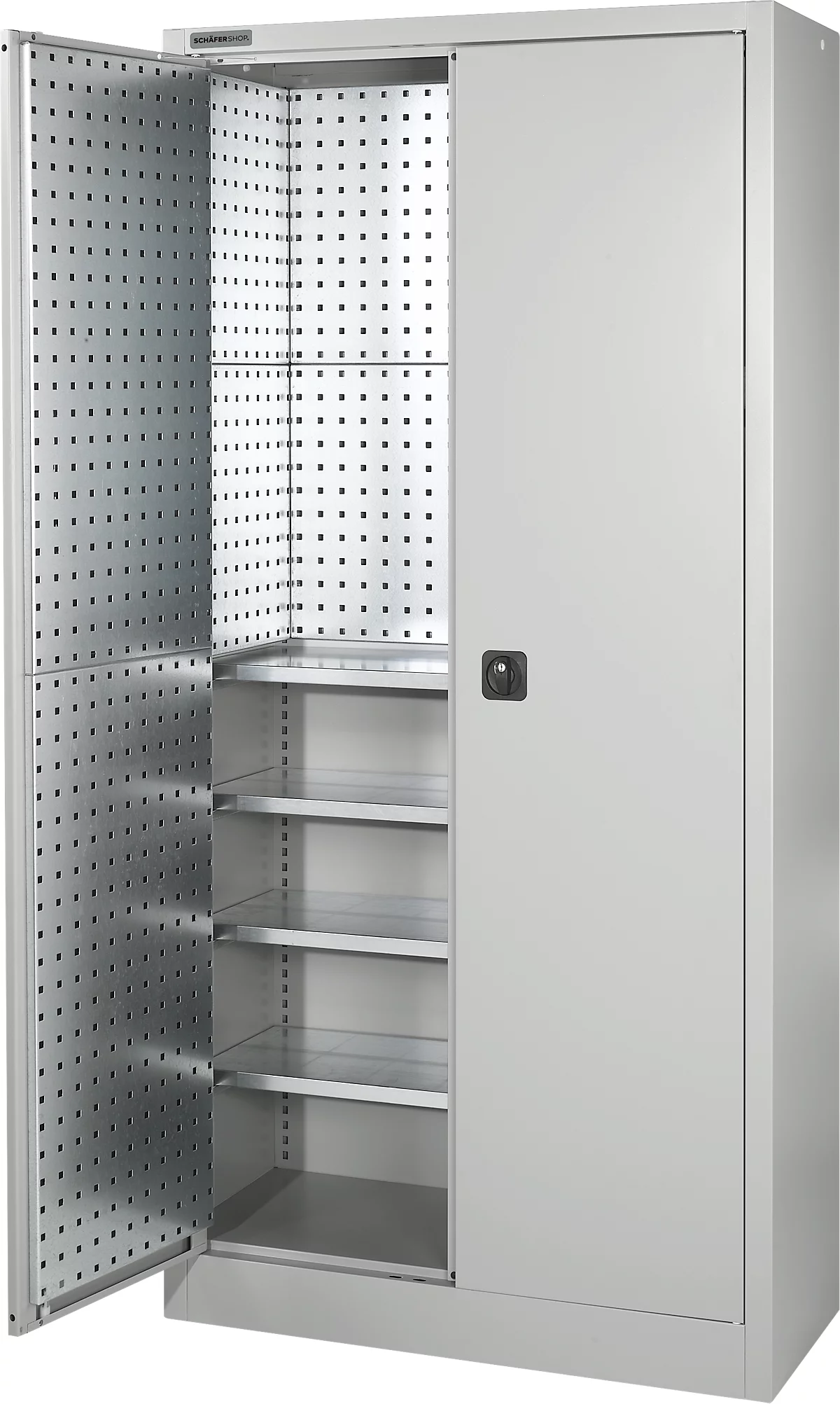 Die Lochrasterwände erstrecken sich über die gesamte Höhe der Tür des 1935 mm hohen Schranks. Die Rückwand und Seitenwand des Korpus verfügen in der oberen Hälfte über Lochrasterwände. Der untere Teil ist mit 4 Fachböden versehen und ermöglicht Ihnen eine Unterteilung in verschiedene Fächer. Die Böden sind in einem Raster von 25 mm in der Höhe verstellbar und ermöglichen somit höchste Flexibilität in der Unterteilung einzelner Fächer. Sie nehmen jeweils bis zu 50 kg an Last auf. Die Materialien im Schrank sind vor dem unbefugten Zugriff Dritter durch ein Zweiverriegelungssystem geschützt: dem Schubstangen-Verschluss mit Drehgriff und dem Sicherheitszylinderschloss. Die verstärkten Flügeltüren schließen bündig mit der Außenfront ab und verfügen über geräuschdämpfende Gummipuffer und innenliegende Scharniere.