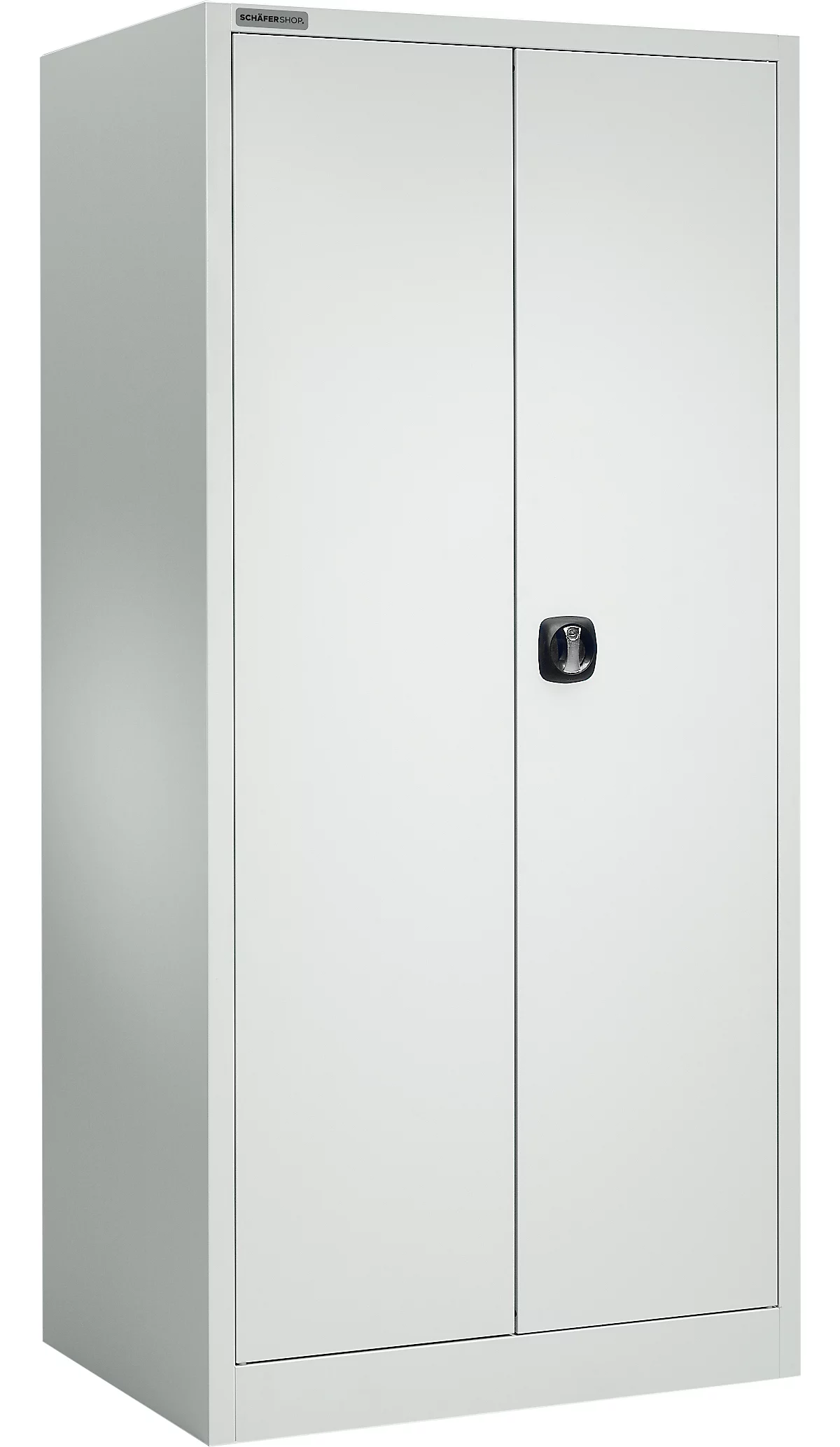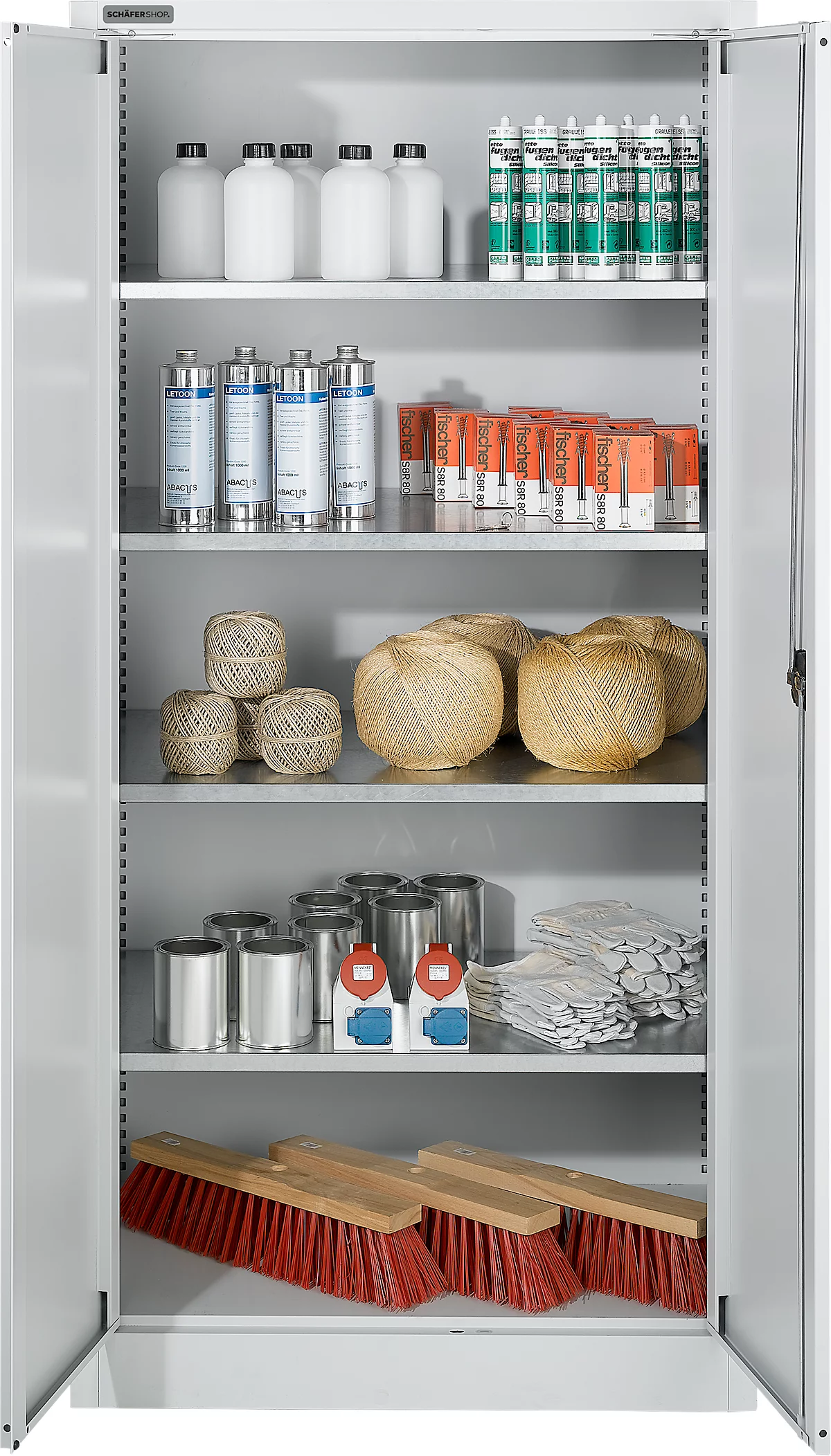 Die verzinkten Böden können mit Materialien bis zu insgesamt 50 kg belastet werden. Die im Schrank befindlichen Materialien sind über einen Schubstangen-Verschluss mit Drehgriff und ein Sicherheitszylinderschloss zu jederzeit sicher verstaut. Die verstärkten Flügeltüren sind mit geräuschdämpfenden Gummipuffern schließen bündig mit der Außenfront ab und verfügen über innenliegenden Scharnieren.