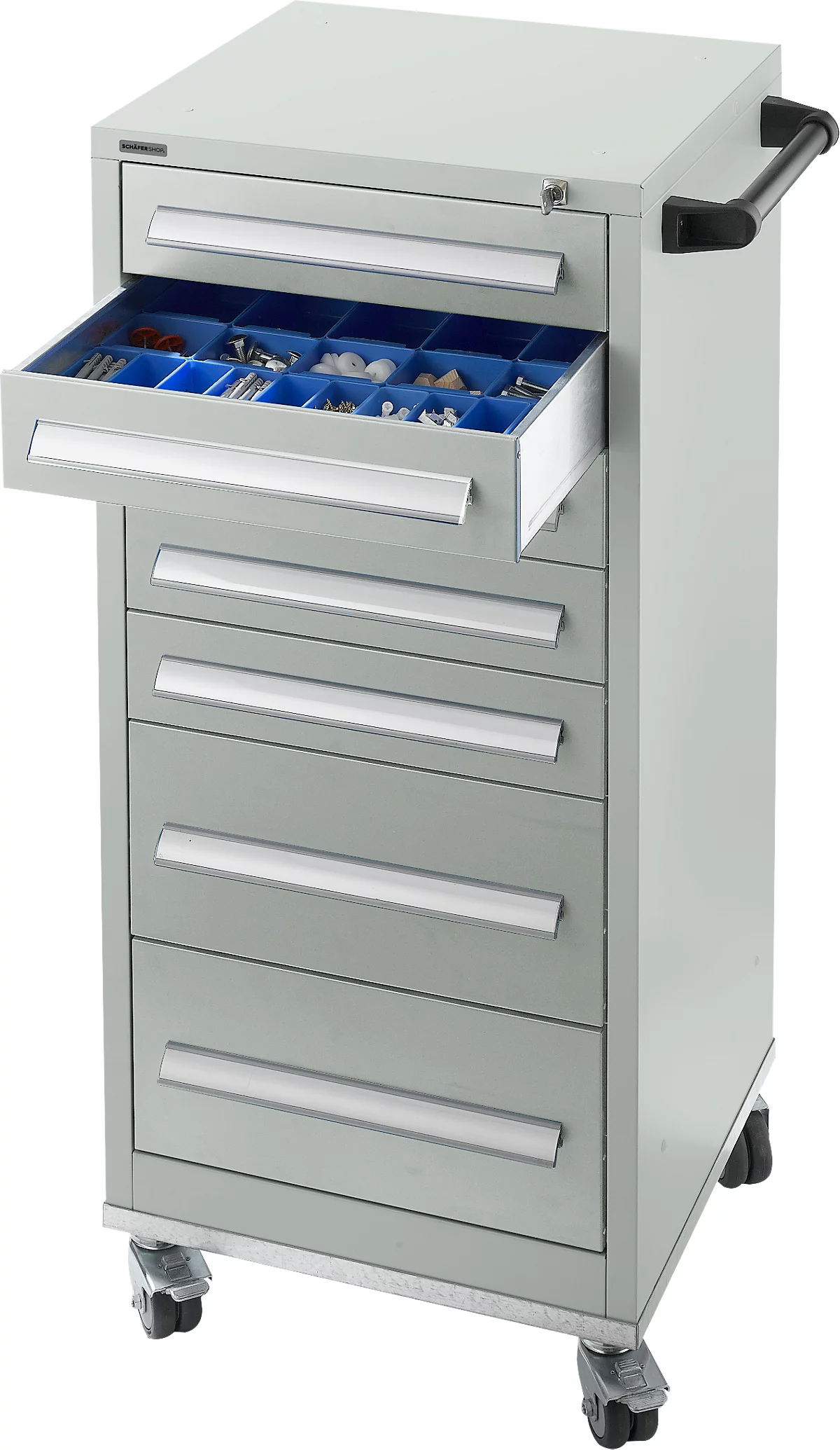 Gehäuse aus Stahlblech und mit einer widerstandsfähigen Pulverbeschichtung in weißaluminium RAL 9006. Schubladen mit Einfachauszug und Anschlag zur Sicherung gegen Herausfallen. Mit Zentralverschluss (2 Schlüssel).