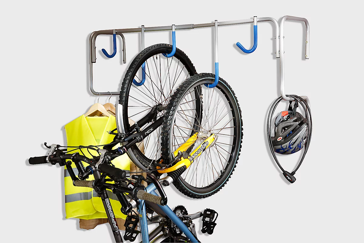 - Einhängehaken für platzsparendes Parken der Fahrräder mit Richtung schräg nach oben, jeweils mit felgenschonender Kunststoffbeschichtung