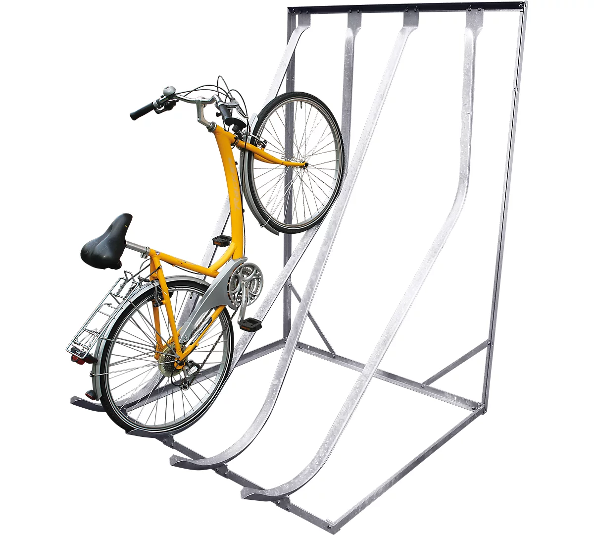 Diese sind in abwechselnder Hoch-/Tief-Stellung angebracht, sodass die Fahrräder besonders platzsparend in Richtung schräg nach oben geparkt werden können. Der Radabstand beträgt dabei jeweils 350 mm. Zudem können die Einhängeschienen einfach mit Schlössern versehen werden, sodass die Fahrräder vor Diebstahl geschützt sind.