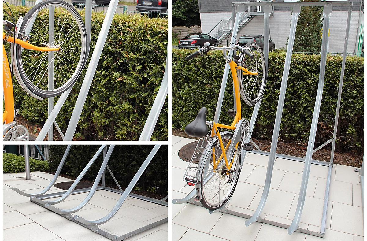 - Abwechselnde Hoch-/Tief-Stellung der gebogenen Einhängeschienen für platzsparendes Parken der Fahrräder mit Richtung schräg nach oben