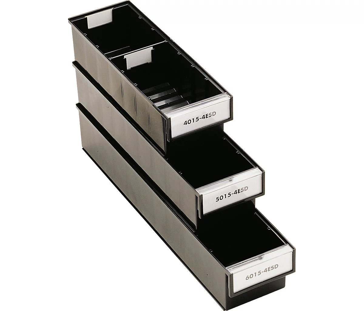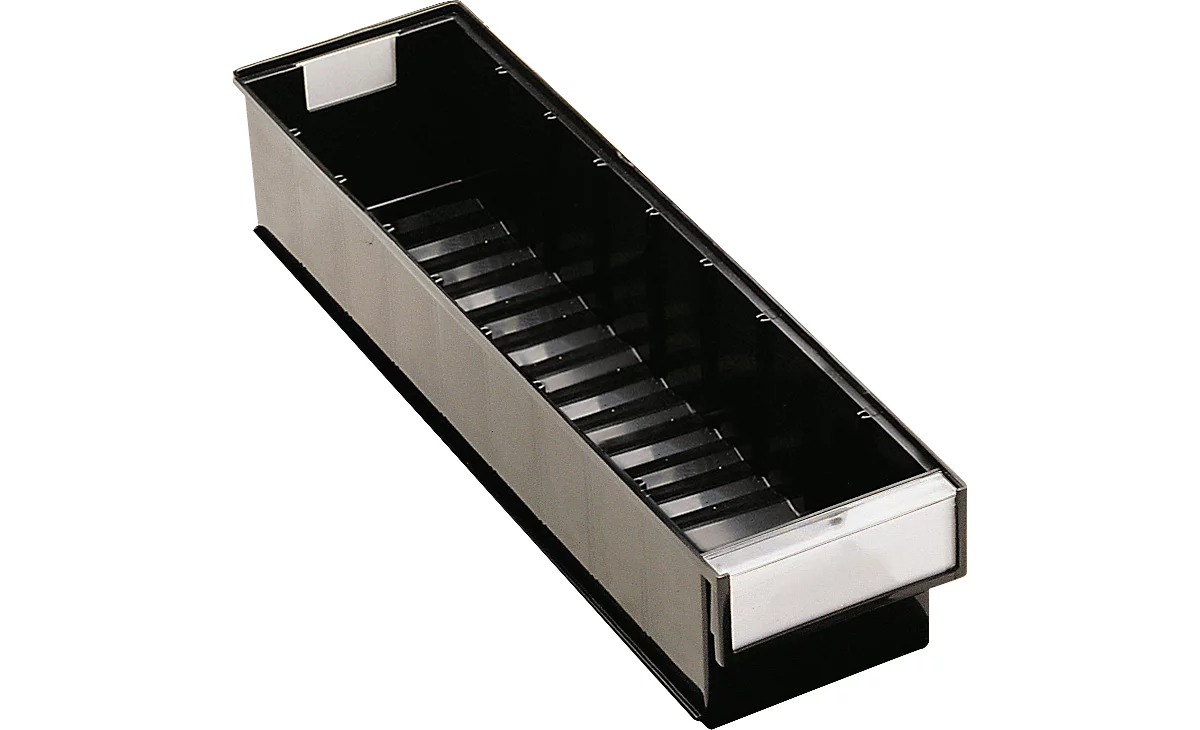 Die Maße der aus leitfähigem Polyprophylen hergestellten Schubladen sind auf die Tiefen gängiger Regalsysteme (300, 400, 500 u. 600 mm) abgestimmt.
