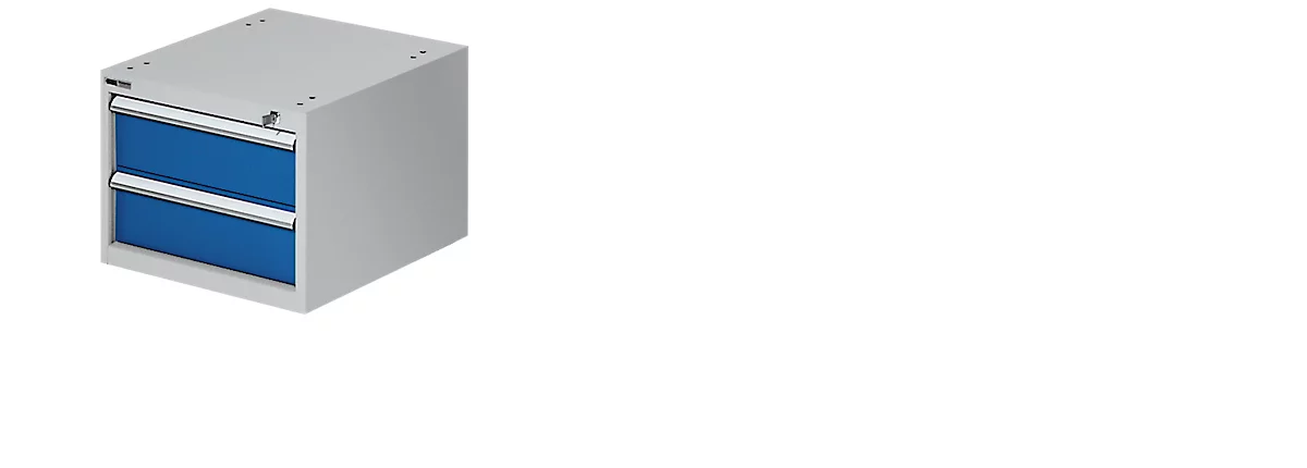 Die Kästen erhalten Sie in verschiedenen Schubladen-Kombinationen, Korpus wahlweise lichtgrau (RAL 7035) oder hellsilber einbrennlackiert. Die Schubladen (blau RAL 5010) laufen auf Präzisions-Kugellagerführungen und sind pro Kasten zentral verschließbar. Alle Schubladen mit durchgehender, beschriftbarer Griffleiste. Die Schubladenkästen werden unter der Platte befestigt.