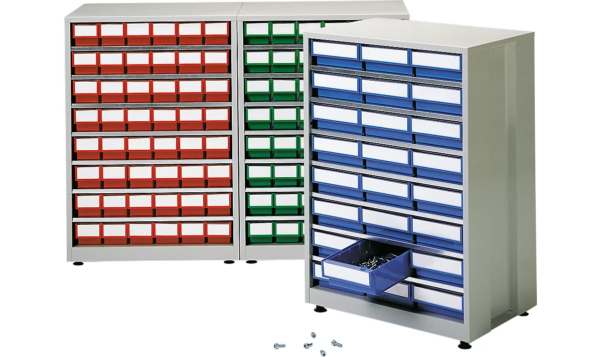 Schubladen aus Polypropylen, temperaturbeständig von -20 bis +90°C, ölbeständig, unempfindlich gegen fast alle Säuren, Laugen und Lösungsmittel. Breite: 92 mm, 3 verschiedene Farben: Rot, Blau und Grün. Die Farben ermöglichen eine deutliche Farbcodierung. Der gewellte Boden erleichtert das Greifen kleiner Teile. Die Schubladen sind mit Zwischenwänden 7-fach unterteilbar.