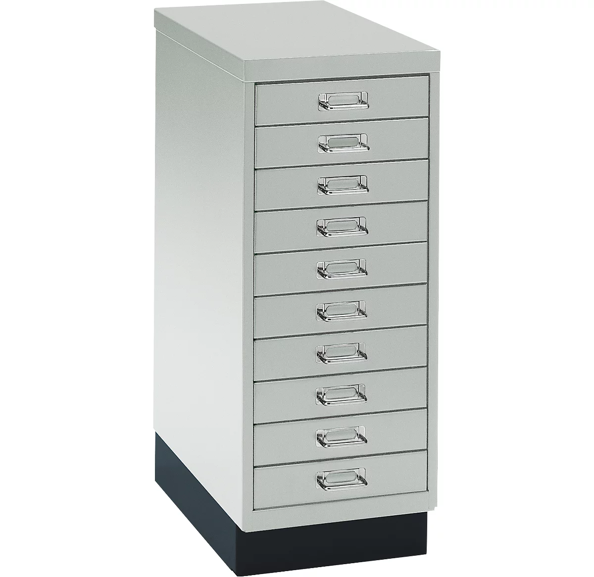 Aus Stahlblech gefertigt und einbrennlackiert. Jede Schublade besitzt einen praktischen Bügelgriff. Mit Einsatzmulden aus Kunststoff lassen sich die Schubladen optimal unterteilen. Durch Etikettenfelder auf den Schubladenfronten ist eine deutliche Kennzeichnung möglich. Sie sind mit einem anthrazitfarbigen Sockel ausgestattet, der gegen einen Rollenuntersatz ausgetauscht werden kann.
