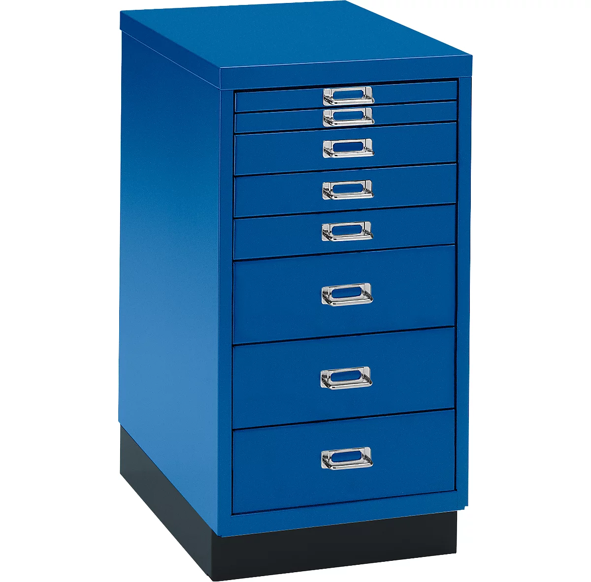 Aus Stahlblech gefertigt und einbrennlackiert. Jede Schublade besitzt einen praktischen Bügelgriff. Mit Einsatzmulden aus Kunststoff lassen sich die Schubladen optimal unterteilen. Durch Etikettenfelder auf den Schubladenfronten ist eine deutliche Kennzeichnung möglich. Sie sind mit einem anthrazitfarbigen Sockel ausgestattet, der gegen einen Rollenuntersatz ausgetauscht werden kann.