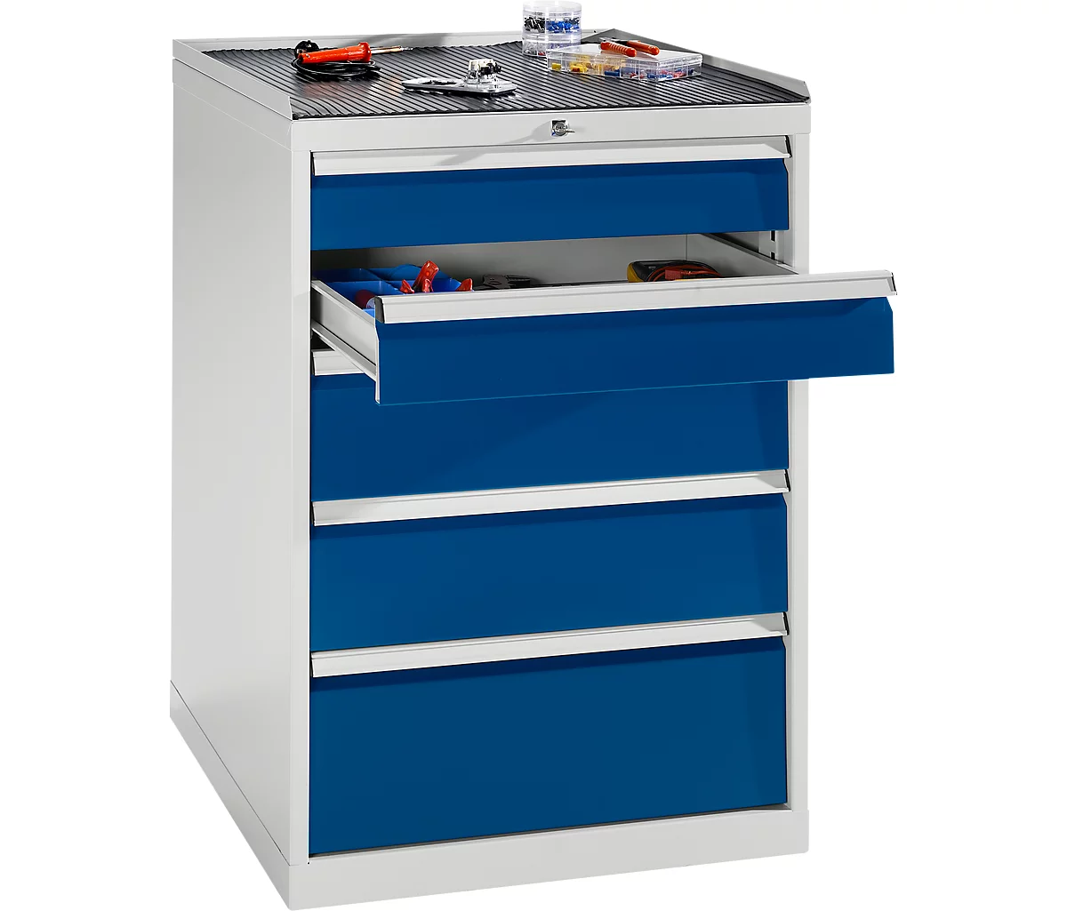 Mit 5 Schubladen, Stoßgriffen und Rollenführung. Schrankhöhe: 1030 mm. Die Schrankbreite beträgt 720 mm. Innenmaße Schubladen: B 615 x T 555 mm. Der Schrankkorpus ist aus Stahlblech und einer widerstandsfähigen Pulverbeschichtung in lichtgrau (RAL 7035) mit Zentralverschluss (2 Schlüssel). Die Schubkastenblenden sind enzianblau (RAL 5010). Die Schubladen mit Stoßgriffen und haben eine Rollenführung. Jede Schublade hat eine Tragkraft von 80 kg.