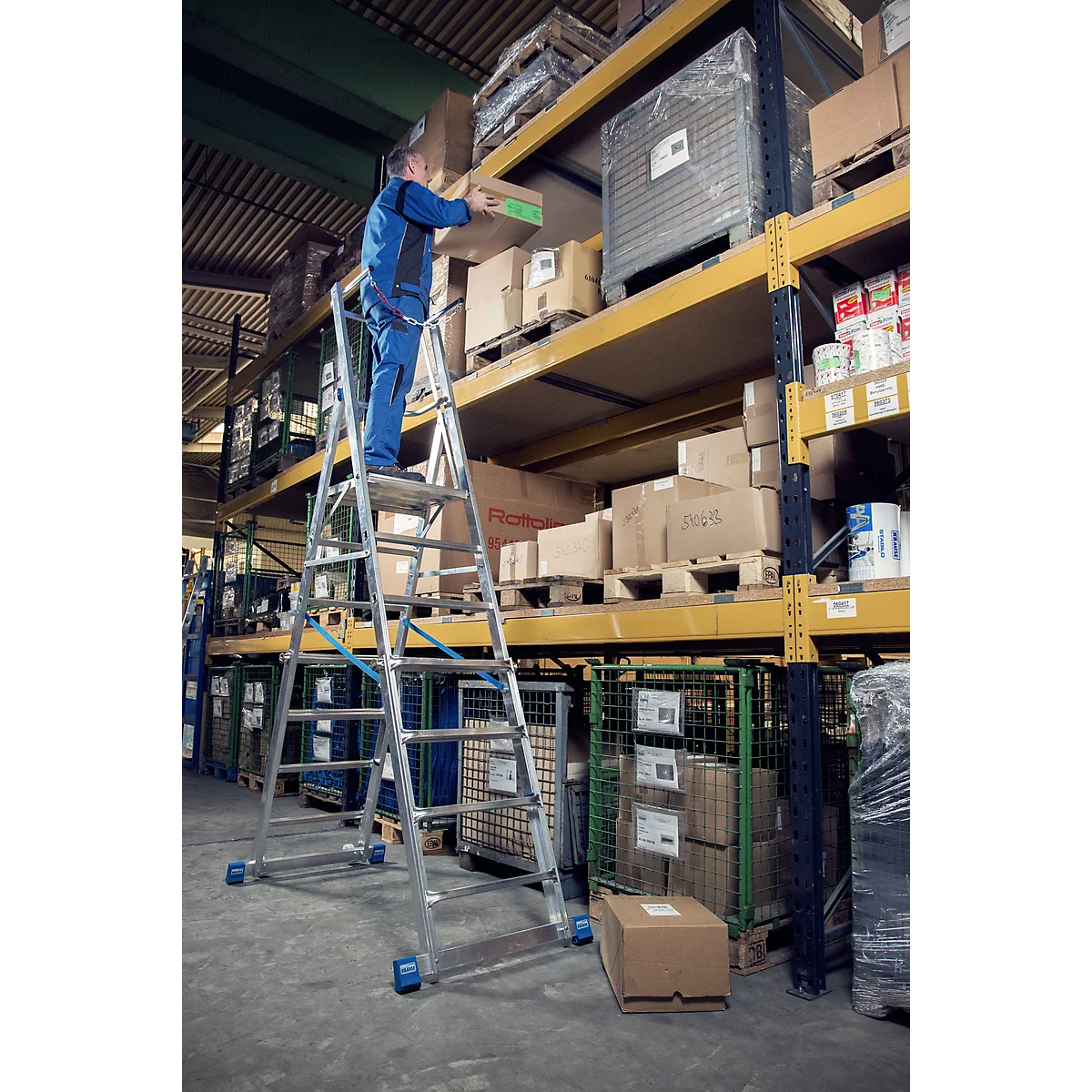 - Arbeitshöhe: bis 4100 mm (bei 6-8 Sprossen), bis 4600 mm (bei 8-10 Sprossen)