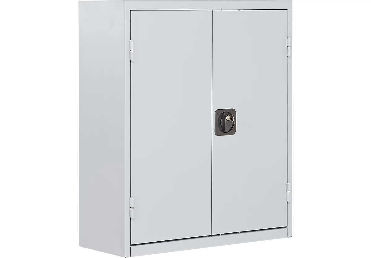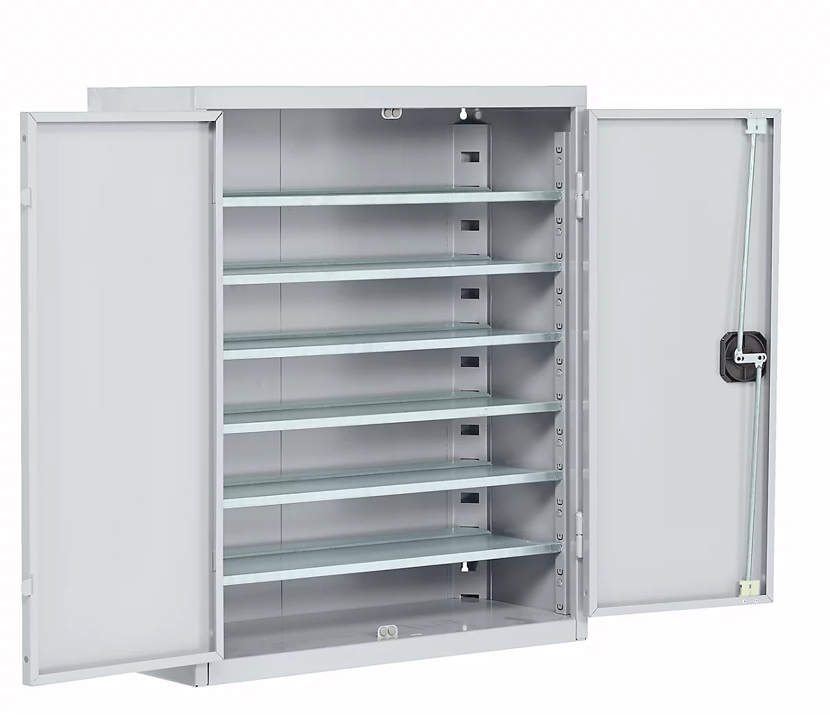 Gehäuse und Türen aus Qualitätsfeinblech, weißaluminium RAL 9006 oder lichtgrau einbrennlackiert. Zwischenböden aus verzinktem Stahlblech, in der Höhe von 25 zu 25 mm verstellbar. Türen mit verchromtem Drehgriff und Sicherheitsschloss. Funktionssicherer Treibriegelverschluss.