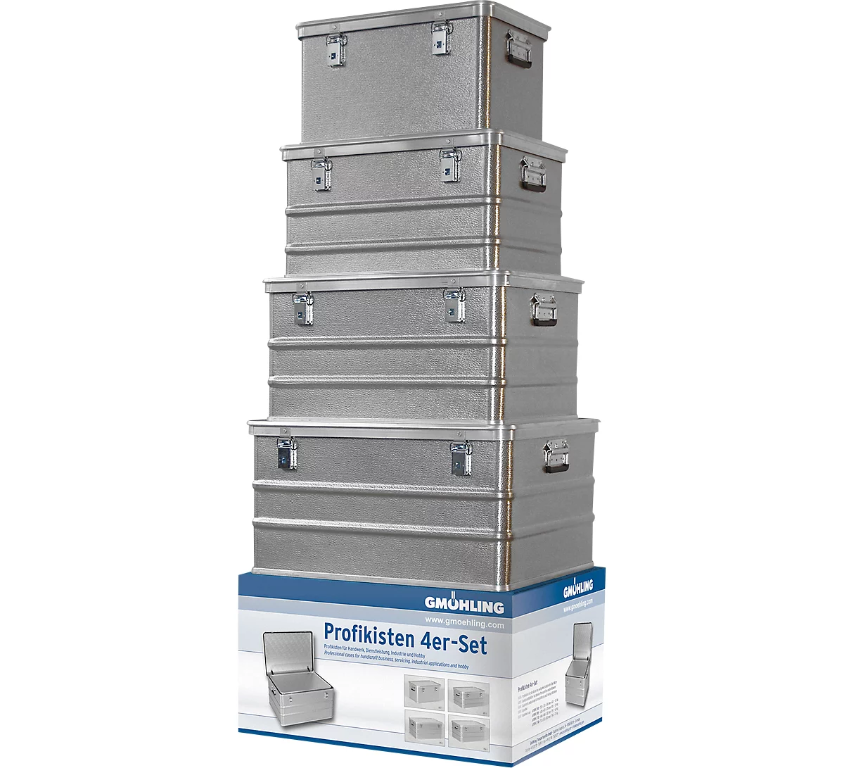Aus besonders robustem und kratzfestem Alu-Dekorblech gefertigt, lassen sich in den Boxen zahlreiche Gegenstände transportieren. Je nach Bedarf, können Sie zwischen vier unterschiedlichen Größen wählen oder gleich das gesamte Set bestellen. Alle Behälter sind mit Klappverschlüssen und Federfallgriffen ausgestattet. Darüber hinaus sind die Boxen stapelbar und dadurch äußerst platzsparend.