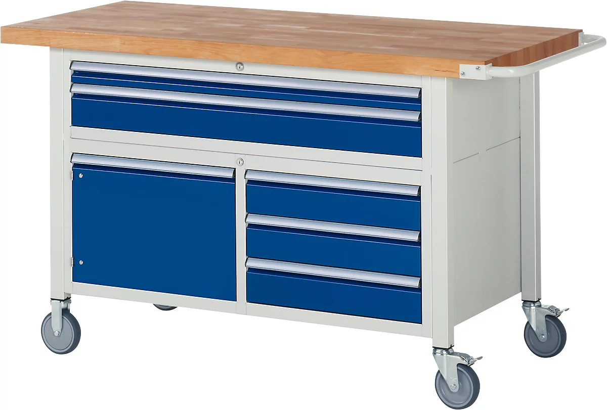 Die fahrbare Werkbank Serie 8922 bietet fünf unterschiedlich große Schubladen und zwei Fachböden mit abschließbaren Türen. Bestellbar ist die Werkbank Serie 8922 in zwei Breiten.
